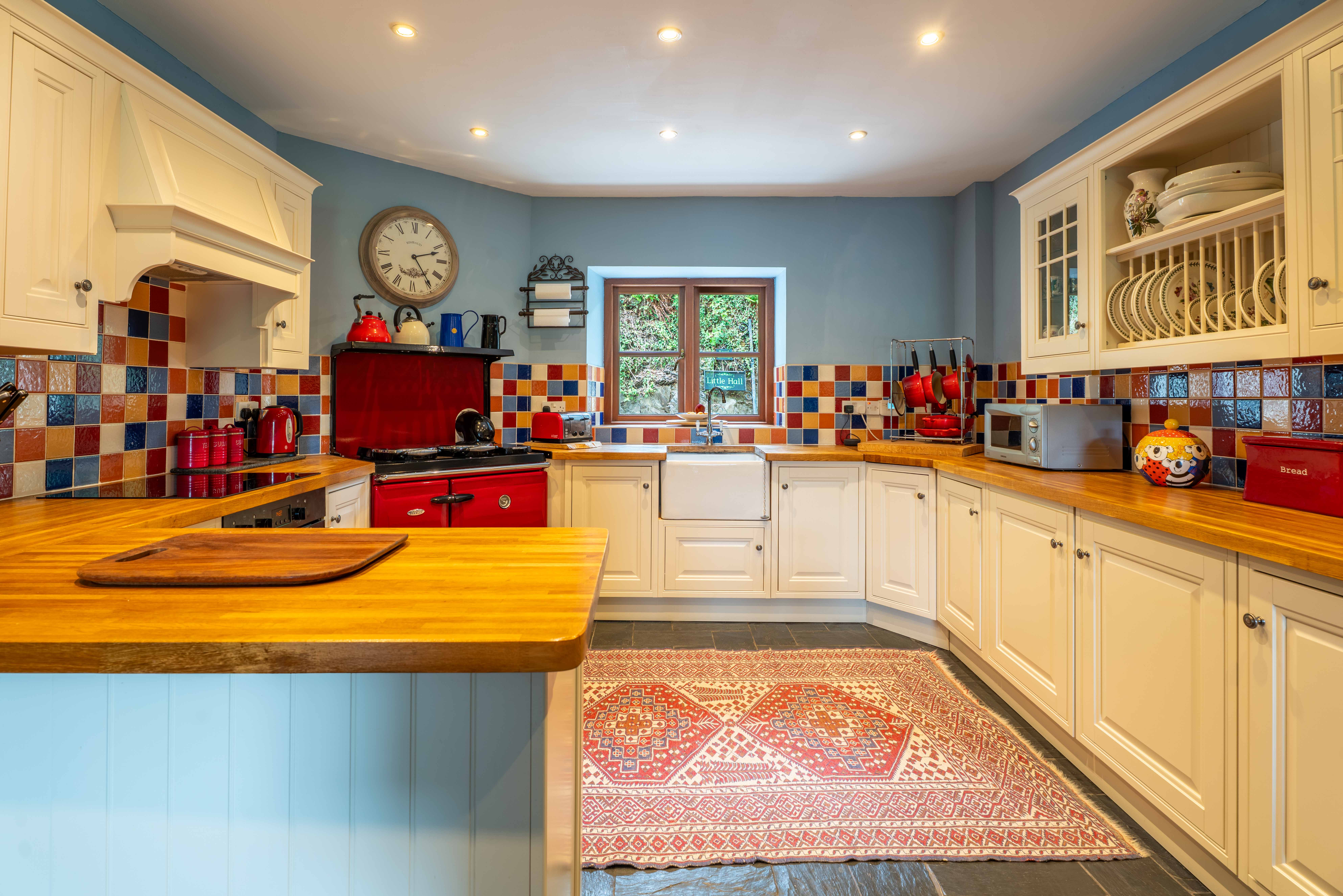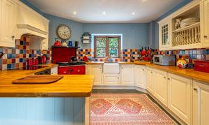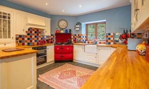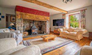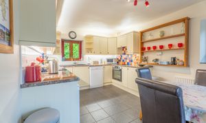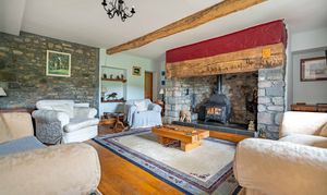 The dining kitchen, complete with wonderful oil fired Stanley oven has a lovely farmhouse kitchen vibe, with ample space for a large dining table, a range of cabinetry, work surfacing over, oven and electric hob and extractor, Butlers sink, mixer tap, display cabinetry and dual aspect windows. Log burner, inset spotlighting, tiling to splash backs, exposed stone wall, Welsh slate flooring. An excellent option for entertaining and socialising and is very much the heart of this family home.