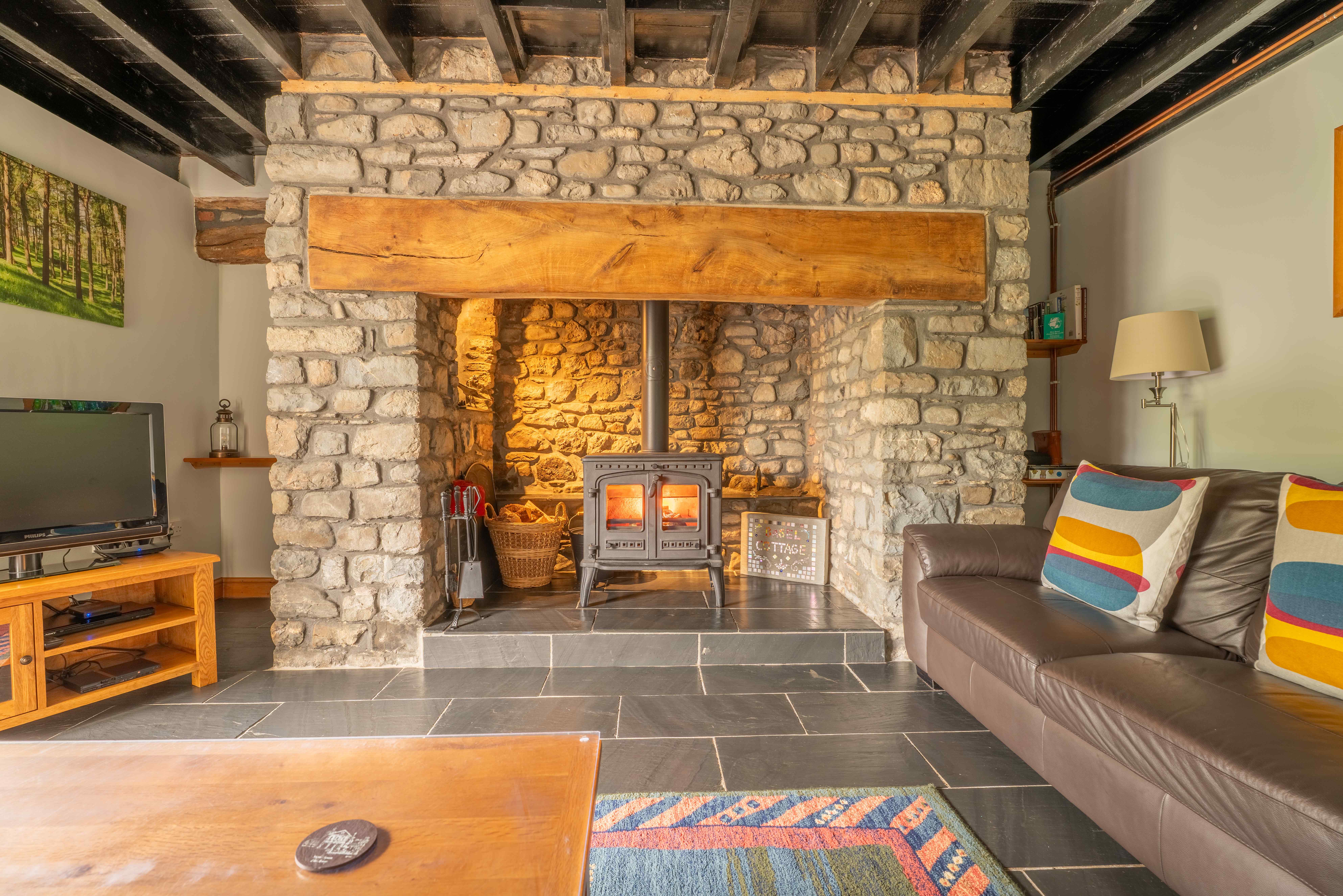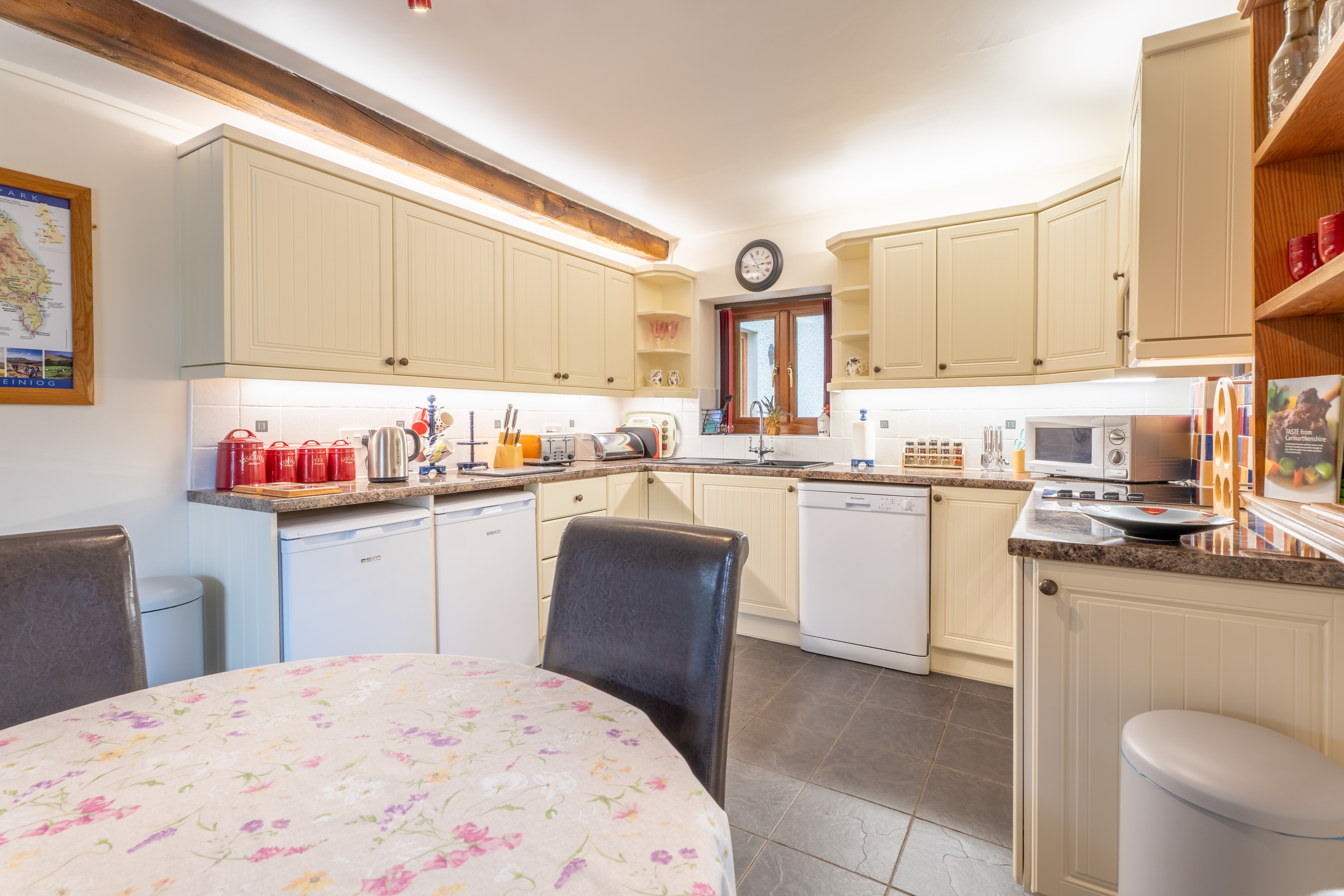 Having period features offering a ‘nod’ to the varied history of this homely dwelling. Large picture window with spacious seating from which you can take in the beautiful views and watch the wildlife close up, an original stone inglenook fireplace with wood burning stove, exposed beams to ceiling and Welsh slate flooring.