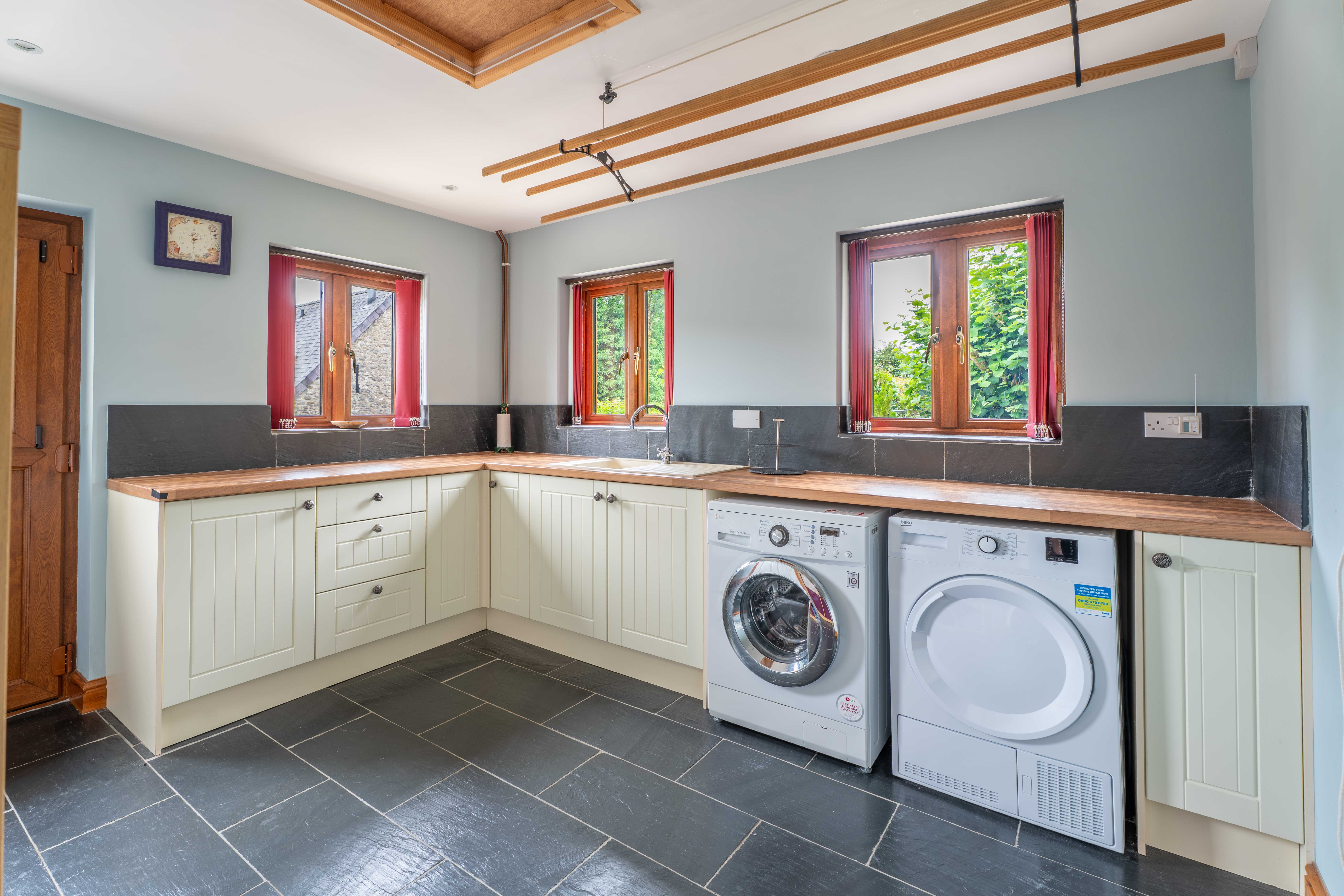 A more recent addition. With its own entrance from outside. Ideal for those muddy, walking the dog, days. The shower room with under floor heating, Welsh Slate flooring, mixer shower and low level WC. An ideal space for laundry with space for appliances, work surfacing, sink unit with mixer tap and traditional ceiling mounted ‘kitchen maid’ pulley clothes airer. Welsh Slate flooring. Loft access hatch.