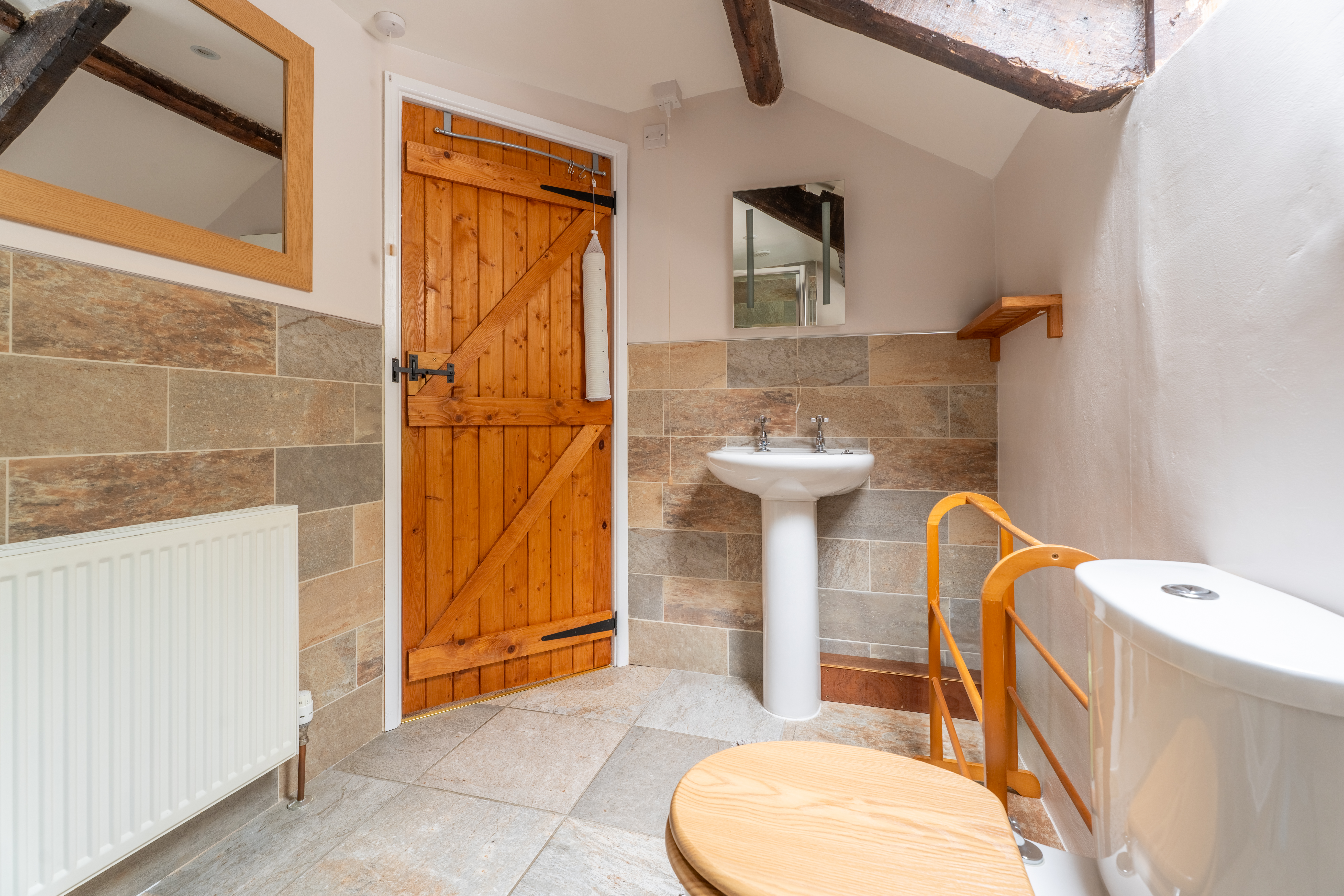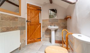 Velux window enabling natural light to cascade through. White suite to comprise: Walk in shower, hand wash basin and low level wc. Exposed beams and tiling to floor.