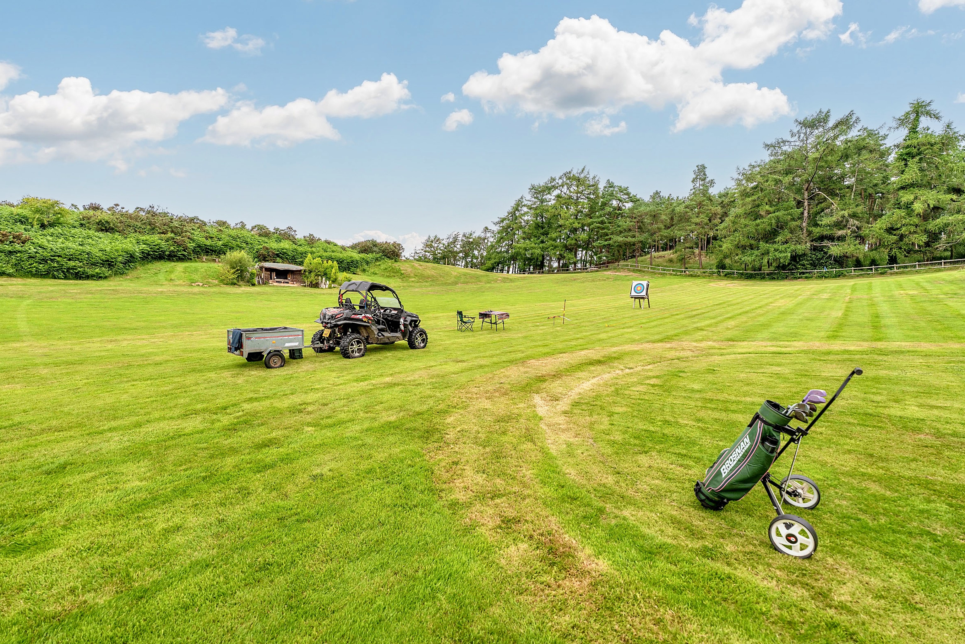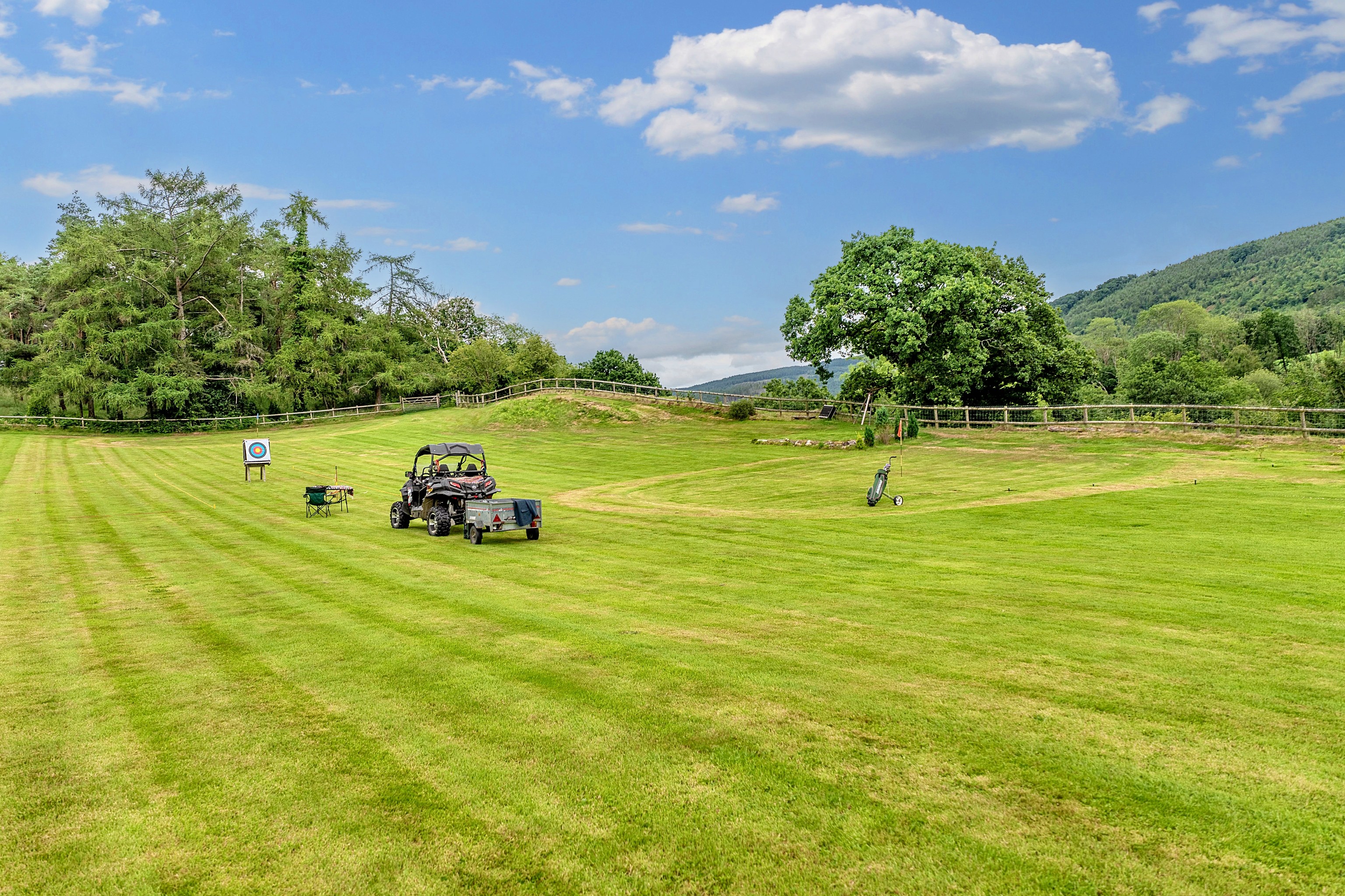 - Offering ample space for the shooting range, 4 hole, 'agricultural' pitch & putt, archery and croquet on the lawn, along with large three car garage currently utilised as a games room.