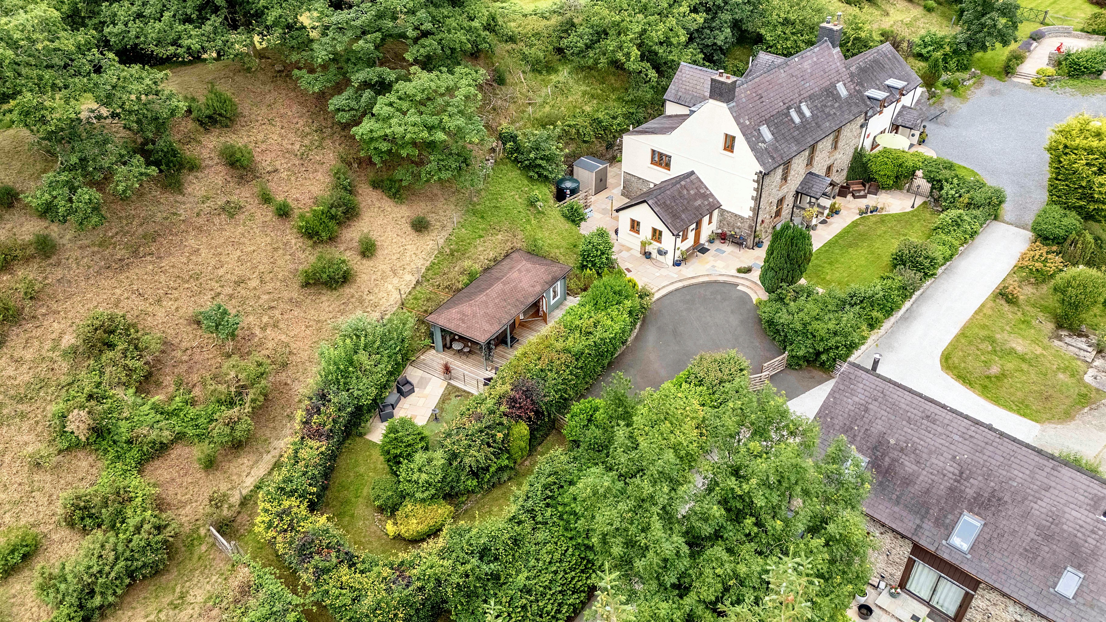 The land is a mix of beautifully landscaped gardens, terraces (one with fire-pit), secret garden with covered hot tub and summer house, woodland and open fields. The enclosed garden runs seamlessly into one field, which has been developed as a four-hole agricultural pitch and putt course with a shooting range, which in turn runs up to an enclosed woodland where you can find many new trees and shrubs with a private cabin offering sanctuary and wonderful views.