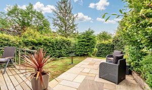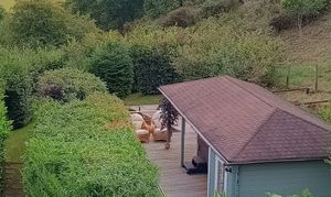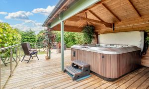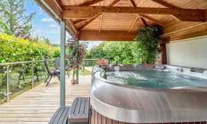 - 'Secret garden' with hot tub and summerhouse.Terraces with views: One with stone and slate firepit with ample seating and the other decked terrace with views over the lower lawn, fields and river.