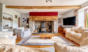 A wonderfully proportioned room with beautiful exposed beams, vaulted ceilings, bespoke handmade cupboards and storage and amazing views .