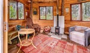 A wonderful, enclosed, private woodland with a variety of native trees, having a special tranquillity all of its own, complete with the hidden ‘cabin in the woods’, hand-made from previously felled trees, having wood burning stove and comfortable chairs to relax and ‘forest bathe’ whilst watching the sanctuary of wildlife, offering a true ‘get away’.