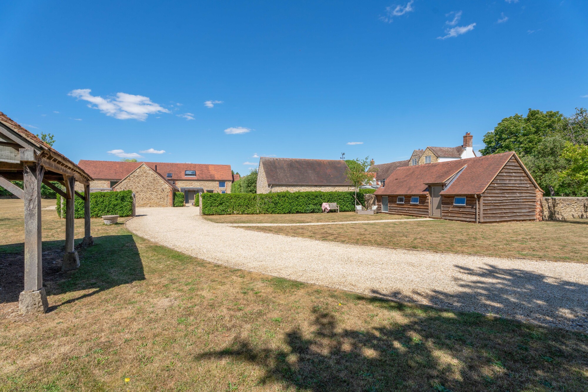 Tucked behind electric timber gates, the gravel driveway sweeps up between the large front lawn and mature hedgerow borders to reach Moorhouse, a characterful former barn, converted in 2019 and now coming to the market with no onward chain.