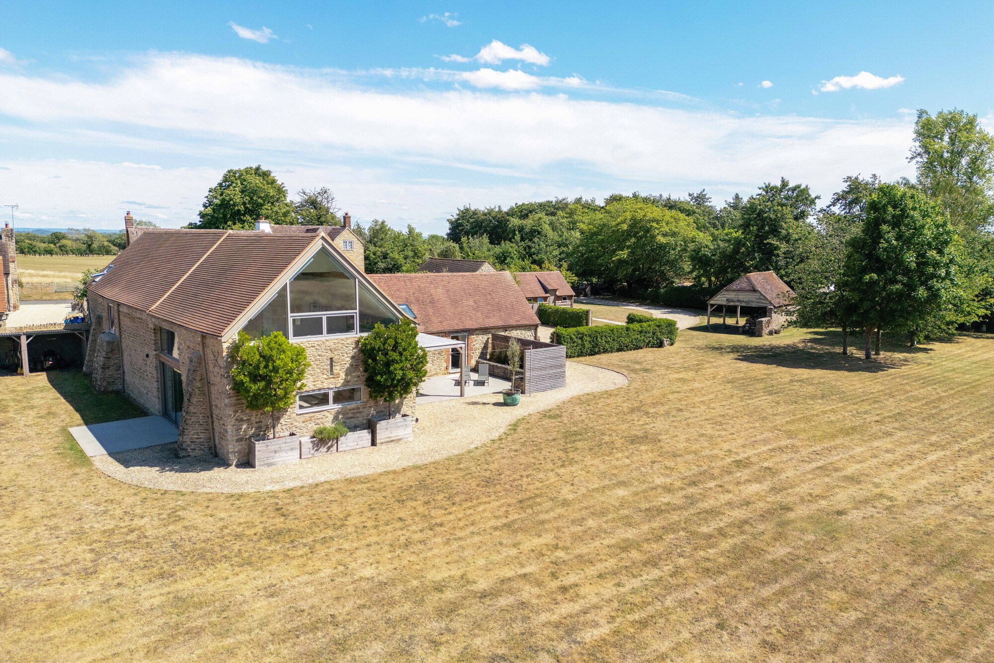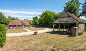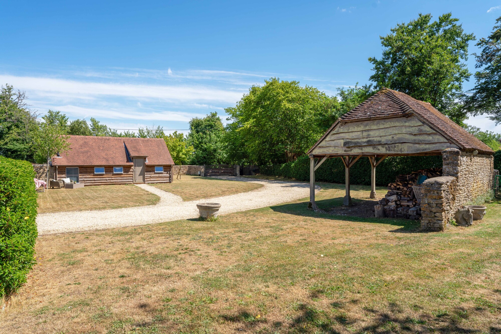 Flanking the gravel approach, a traditional open-fronted cart shed in seasoned oak provides practical storage, its stacked logs sourced sustainably from the private woodland at the edge of the garden, offering a ready supply of woodland-cut fuel to keep the hearth warm throughout the winter.