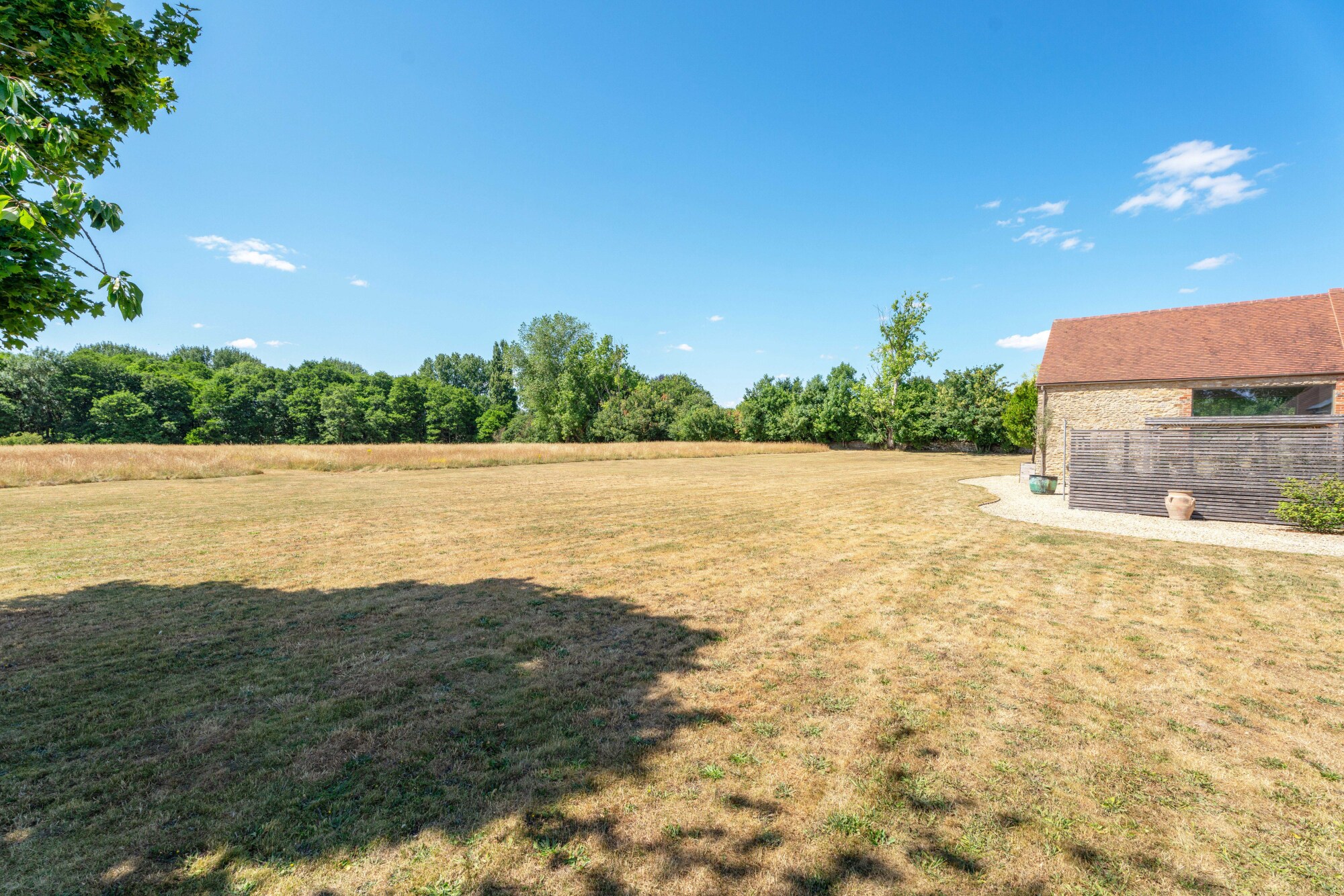 Beyond, the land unfolds into open meadow, ideal for those with equestrian interests, while to the fringe, a secluded belt of woodland brings a wilder, more magical charm, where a shallow stream meanders through the trees.