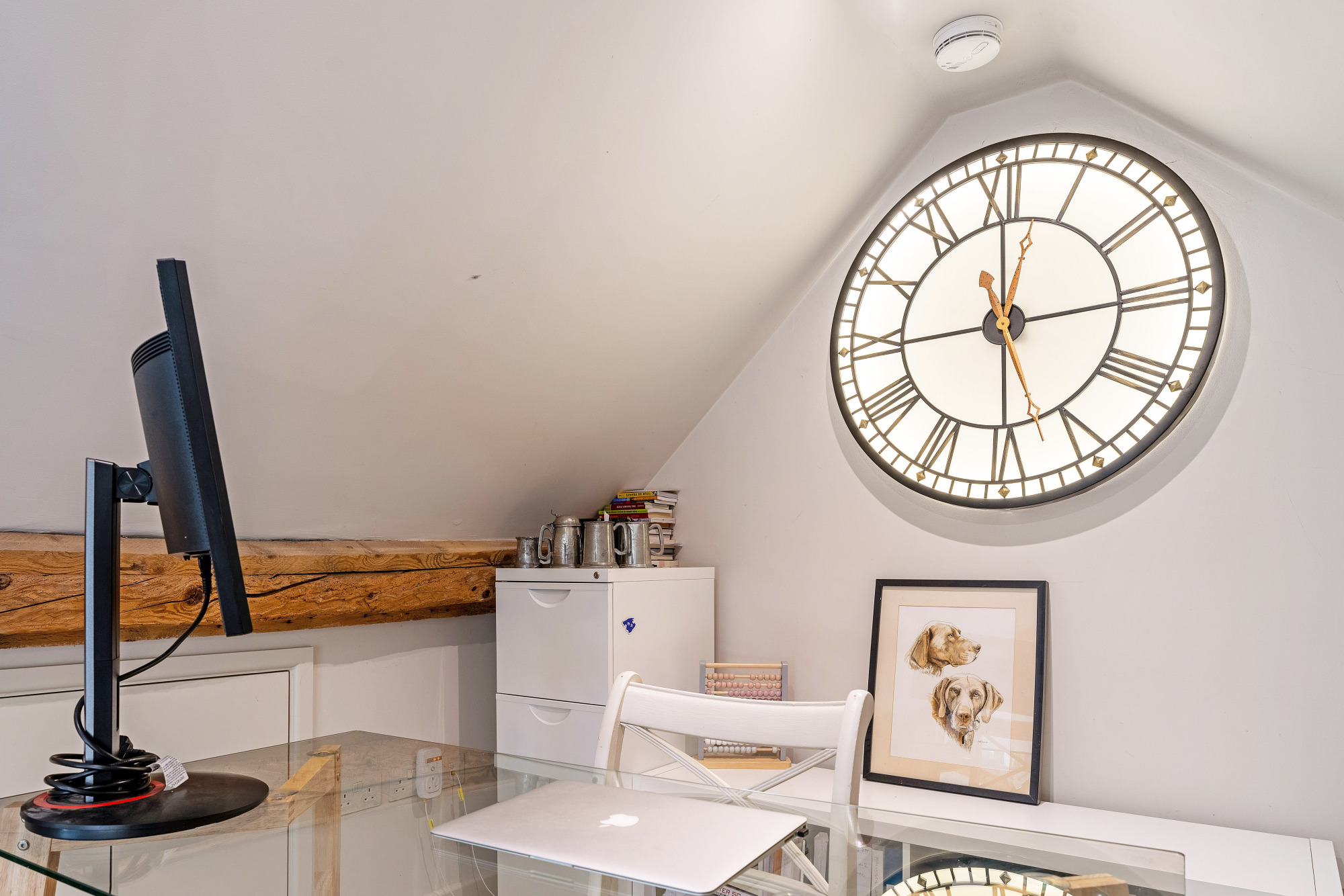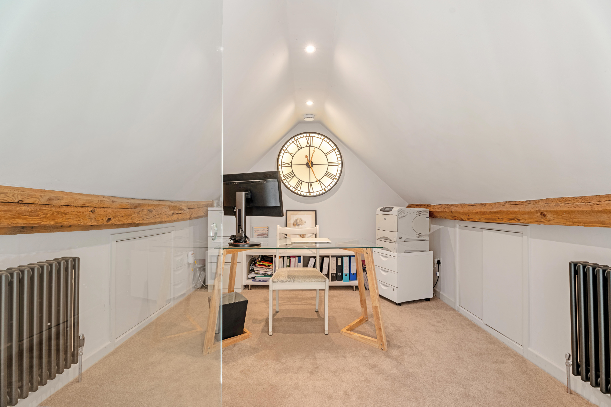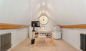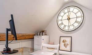 Ascend the elegant spiral staircase from the living room to a mezzanine-level home office. At its centre, a striking backlit clock casts soft, ambient glow across the vaulted space. With room for a desk and bookshelves, this perfectly tucked-away study is the ideal place for remote working, while staying connected to the life of the home below.