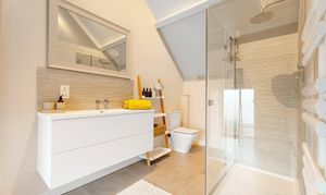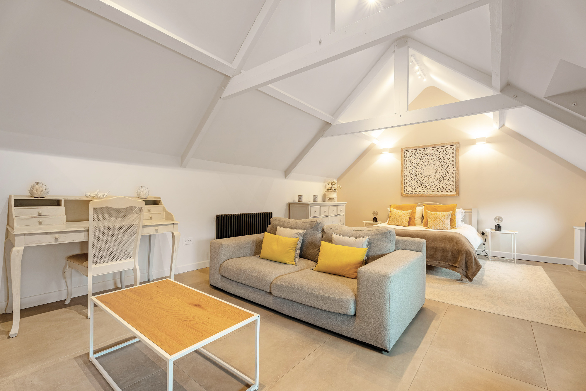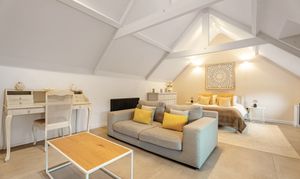 Tucked privately away to the right of the stairs seek sanctuary in the principal suite, a warm and welcoming haven brimming in both light and built-in storage. A privacy wall stands at partial height, dividing the bedroom from the luxurious en suite beyond, where a freestanding bath, twin wash basins and abundant shelving for towels can be found, alongside a heated towel radiator and WC.