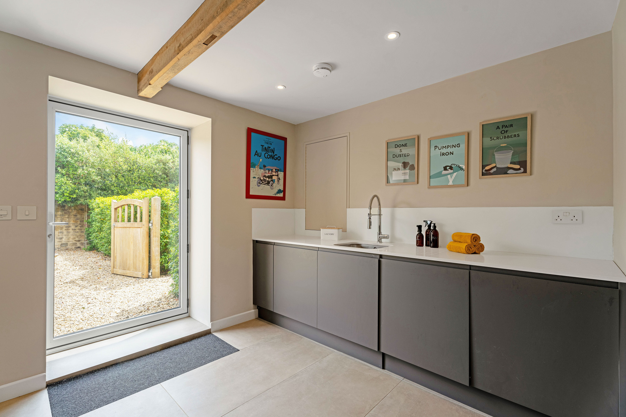 Tucked just off the living room, the laundry room is a stylish extension to Moorhouse’s easy functionality, with additional storage space and plumbing for washing machine and dryer. From here, a glazed door opens out to the front of the home, making it ideal as a boot room entrance for muddy boots and paws.