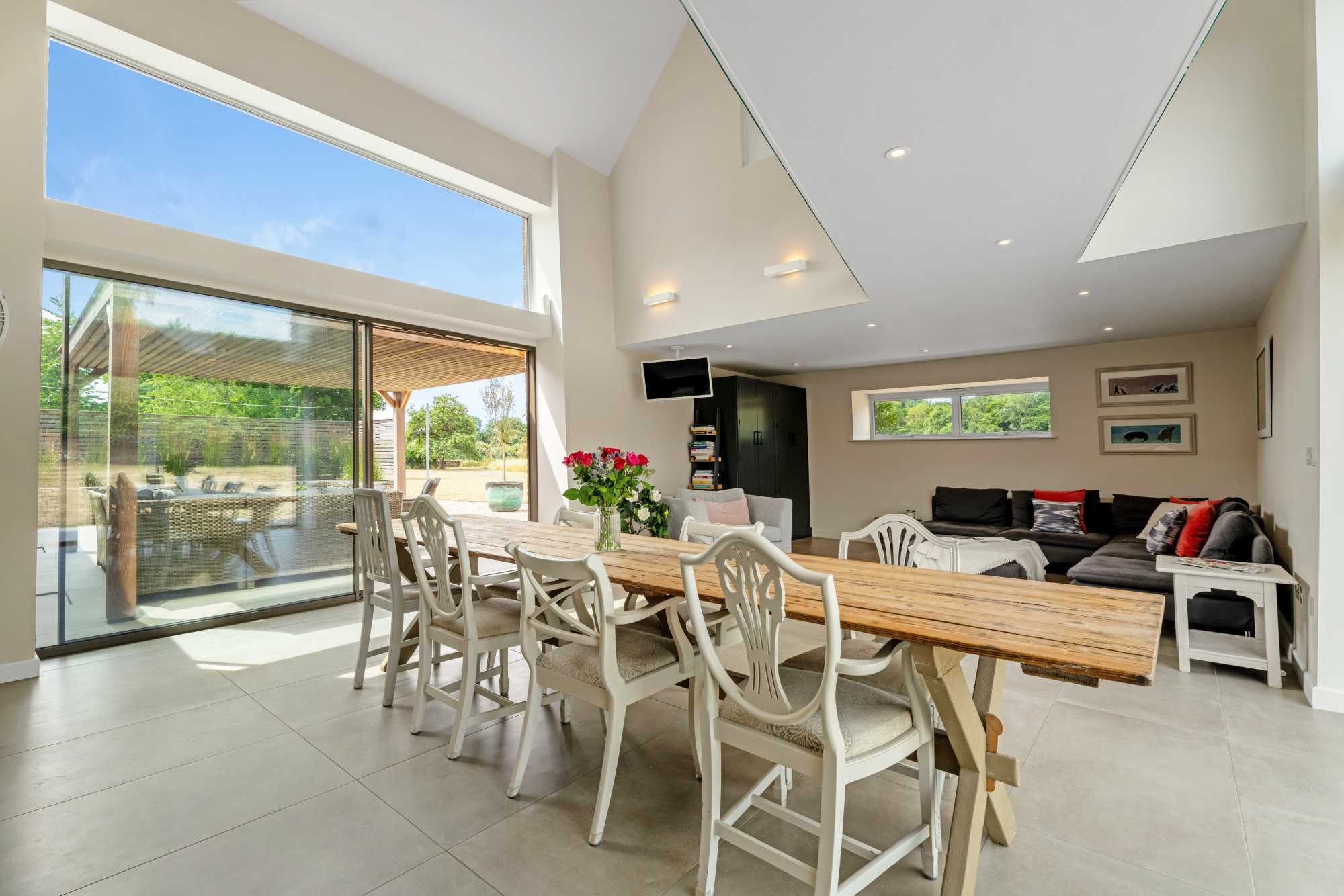 Sliding doors retract to offer instant access out to the garden at both sides, with a sheltered al fresco dining area to the left.