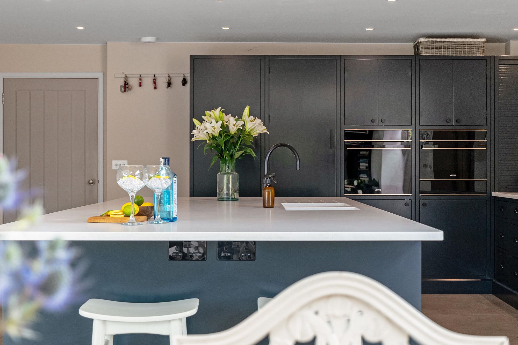 At its centre, a bespoke Parlour Farm kitchen in deep navy tones brings artisan craftsmanship and contemporary elegance, with a ten-year warranty and a full suite of integrated appliances including fridge-freezer, dishwasher, ovens, a Smeg hob and dual fridge drawers.