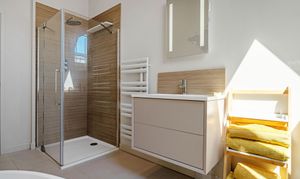 Porcelanosa tiles, imported from Italy, layer the family bathroom in sophistication, on the left, where a freestanding bathtub invites leisurely soaks. Light prevails in this room, with white sanitaryware featured alongside a walk-in shower, while above, the high, beamed ceiling amplifies the airiness within.