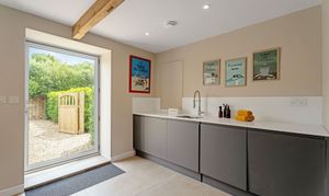 At one end, a contemporary glass-fronted log burner is inset neatly into the wall for days when the cool sets in. In summer, to the rear, a glazed door opens directly onto the patio, inviting the outdoors in.