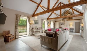 For cosy winter nights, the living room is a space designed for quiet retreat and comfort. Vaulted ceilings lined with exposed timber trusses amplify the ambience, while picture windows draw the garden in, framing tranquil views across the plot. Electric blinds offer ease and elegance, giving full control over light and privacy at the touch of a button.