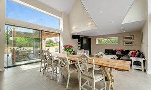 A walkway encased in glass stretches out above the living space below, connecting to another handsome bedroom, where denim blue to the feature wall mirrors the sky captured in the apex window looking out over the tree-lined horizon to the rear, offering phenomenal views out over the six acres of countryside.