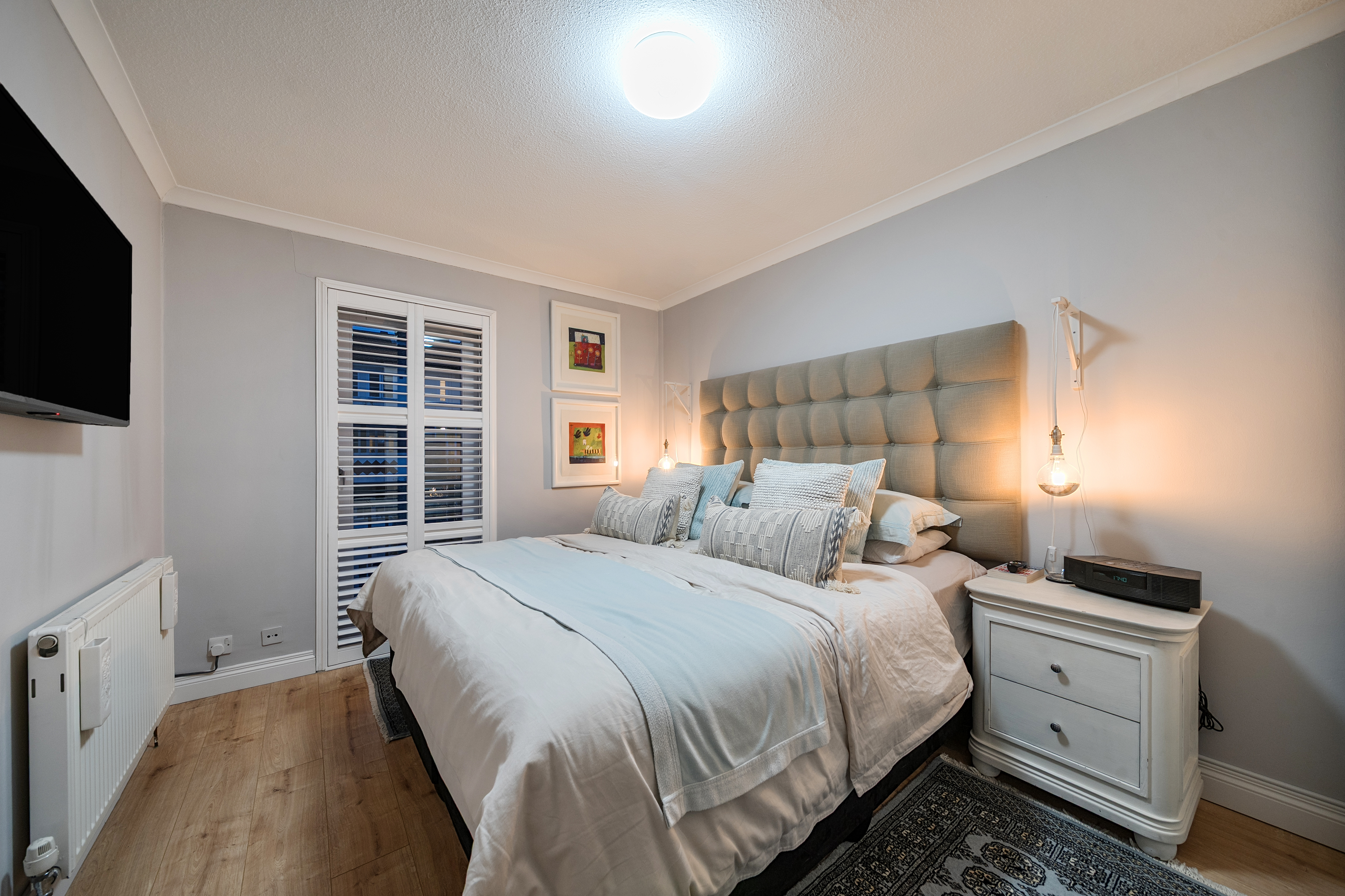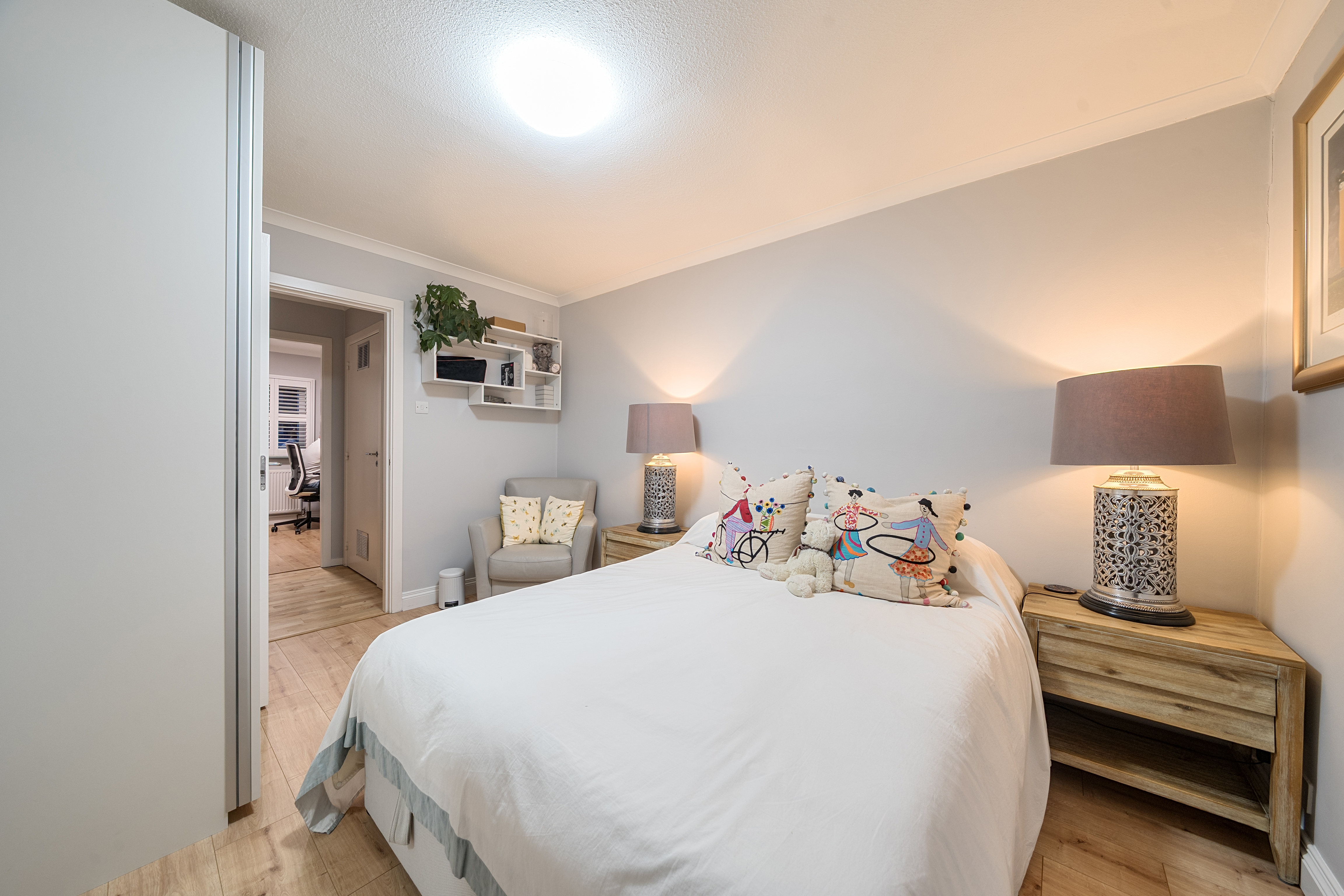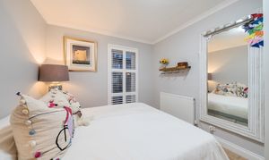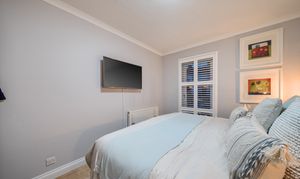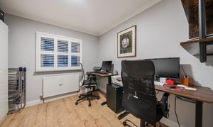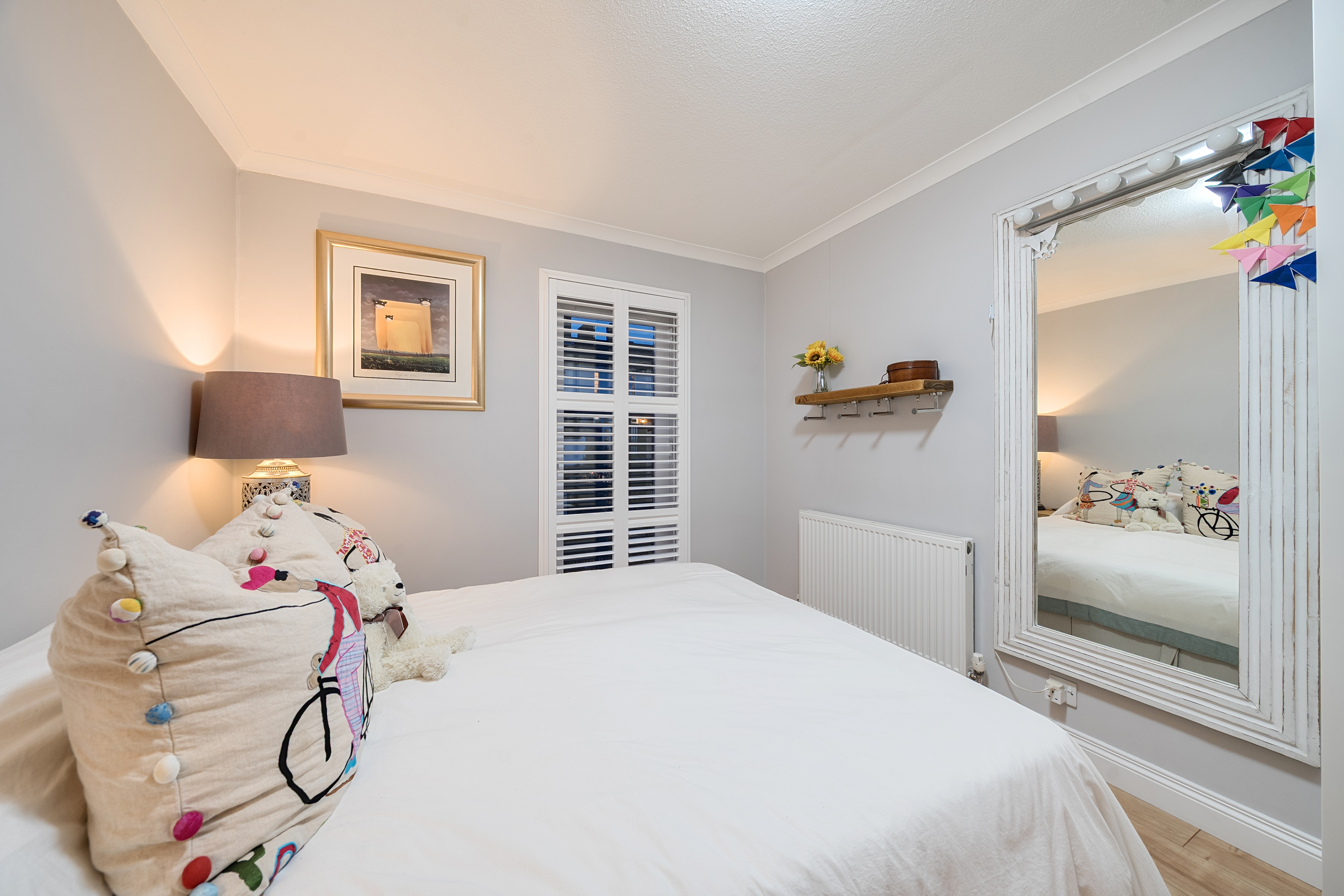All three bedrooms are generously proportioned, with fitted wardrobes providing excellent storage, and bespoke shutters installed throughout the home for privacy and light control.