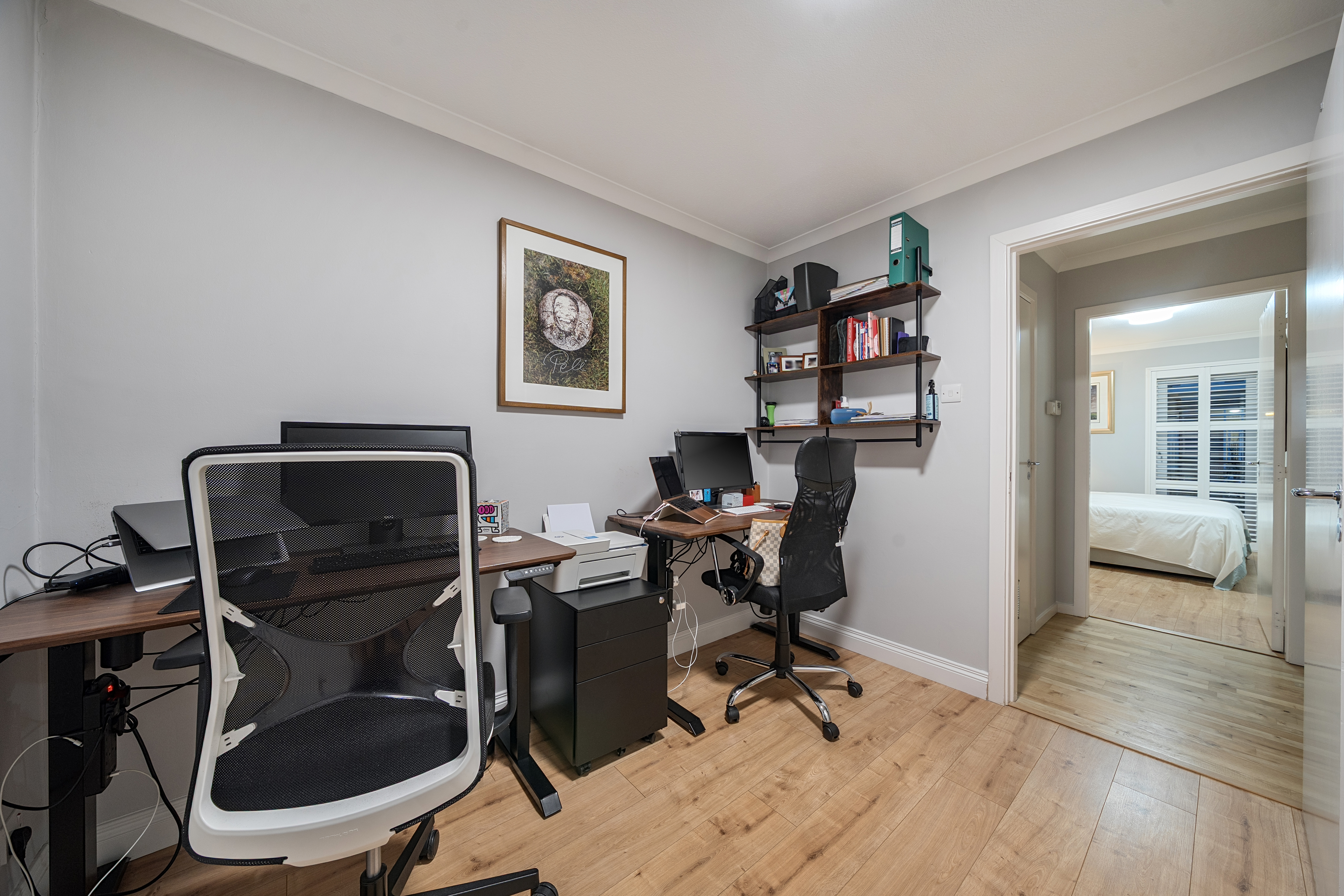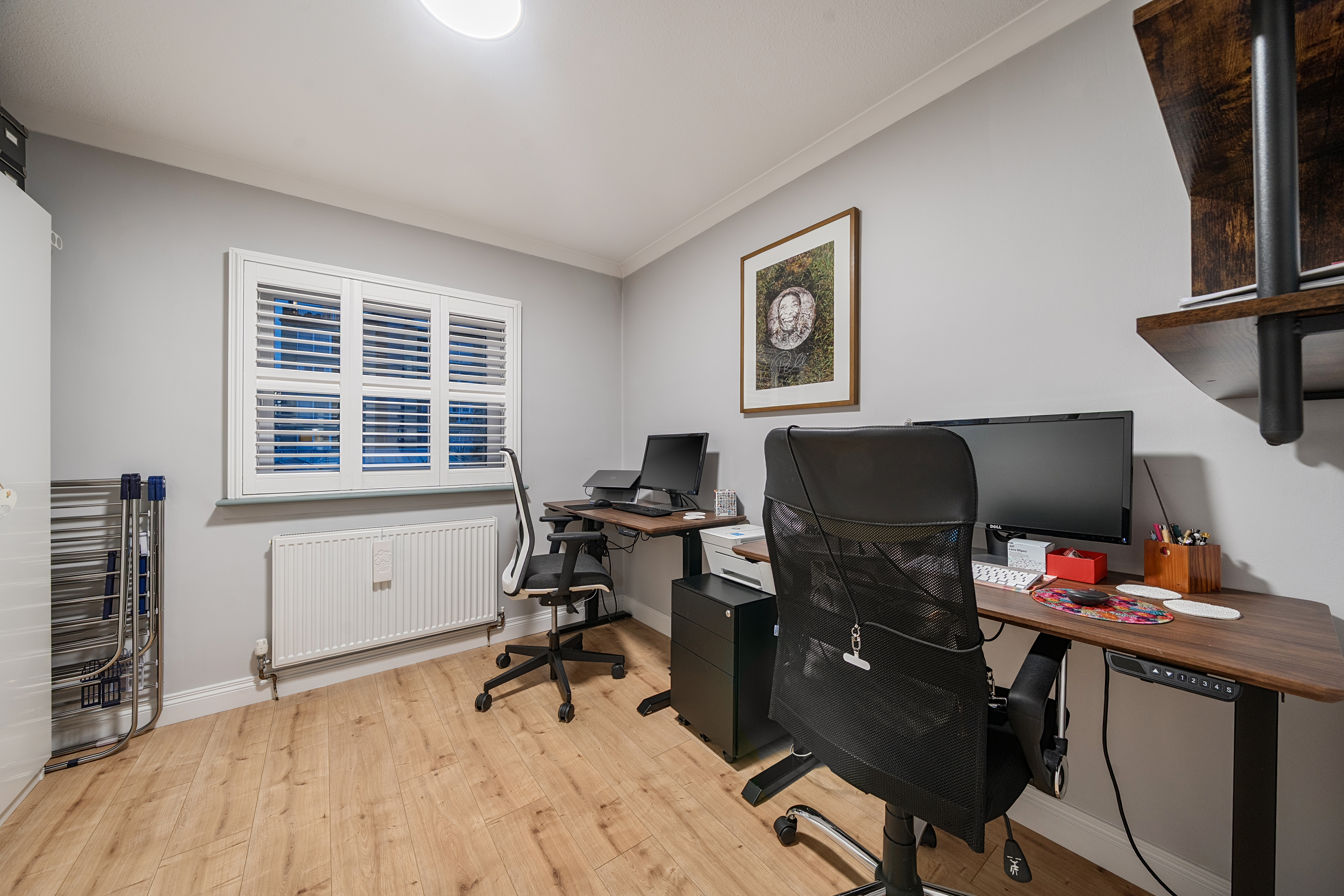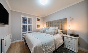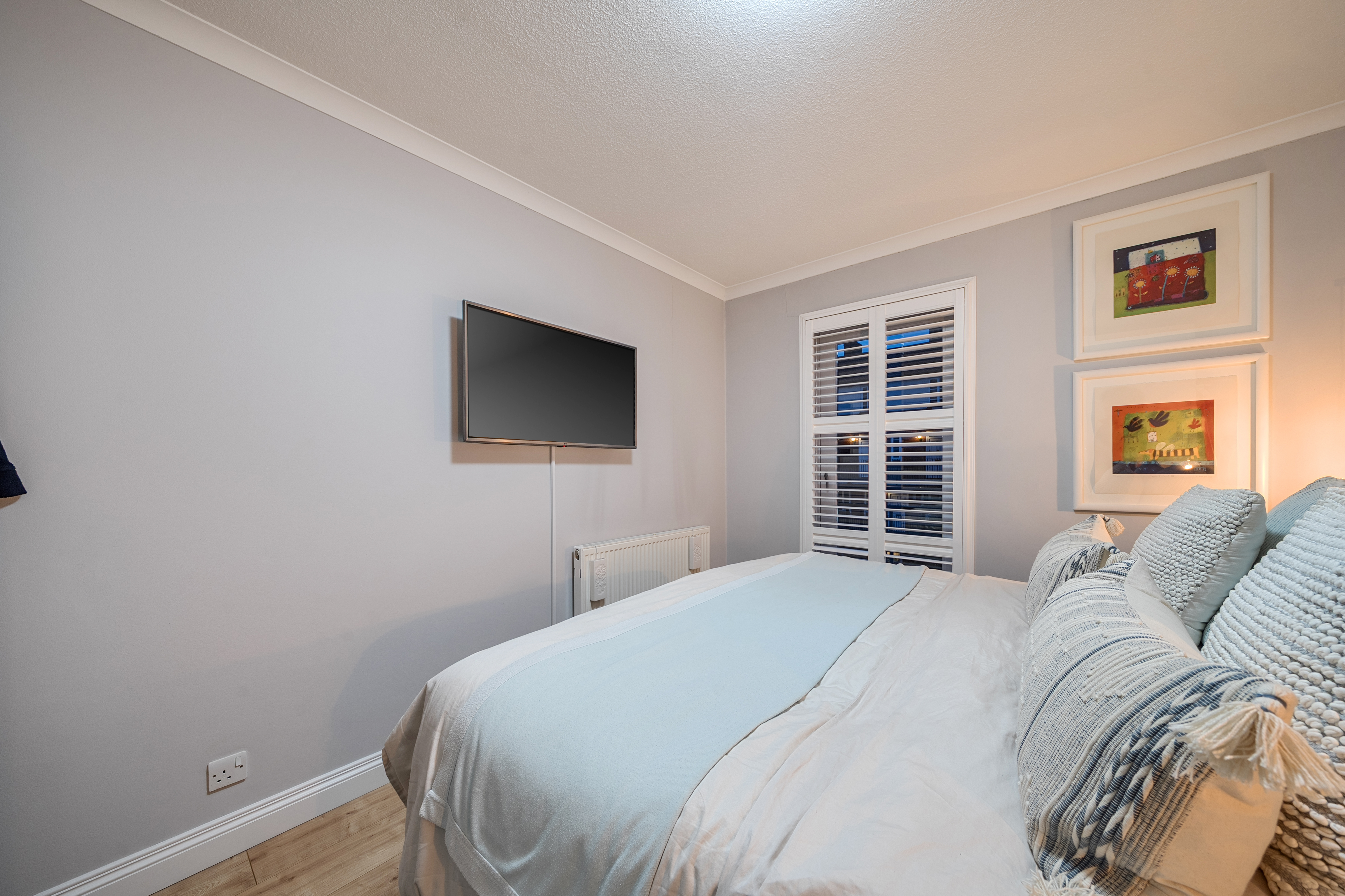 All three bedrooms are generously proportioned, with fitted wardrobes providing excellent storage, and bespoke shutters installed throughout the home for privacy and light control.