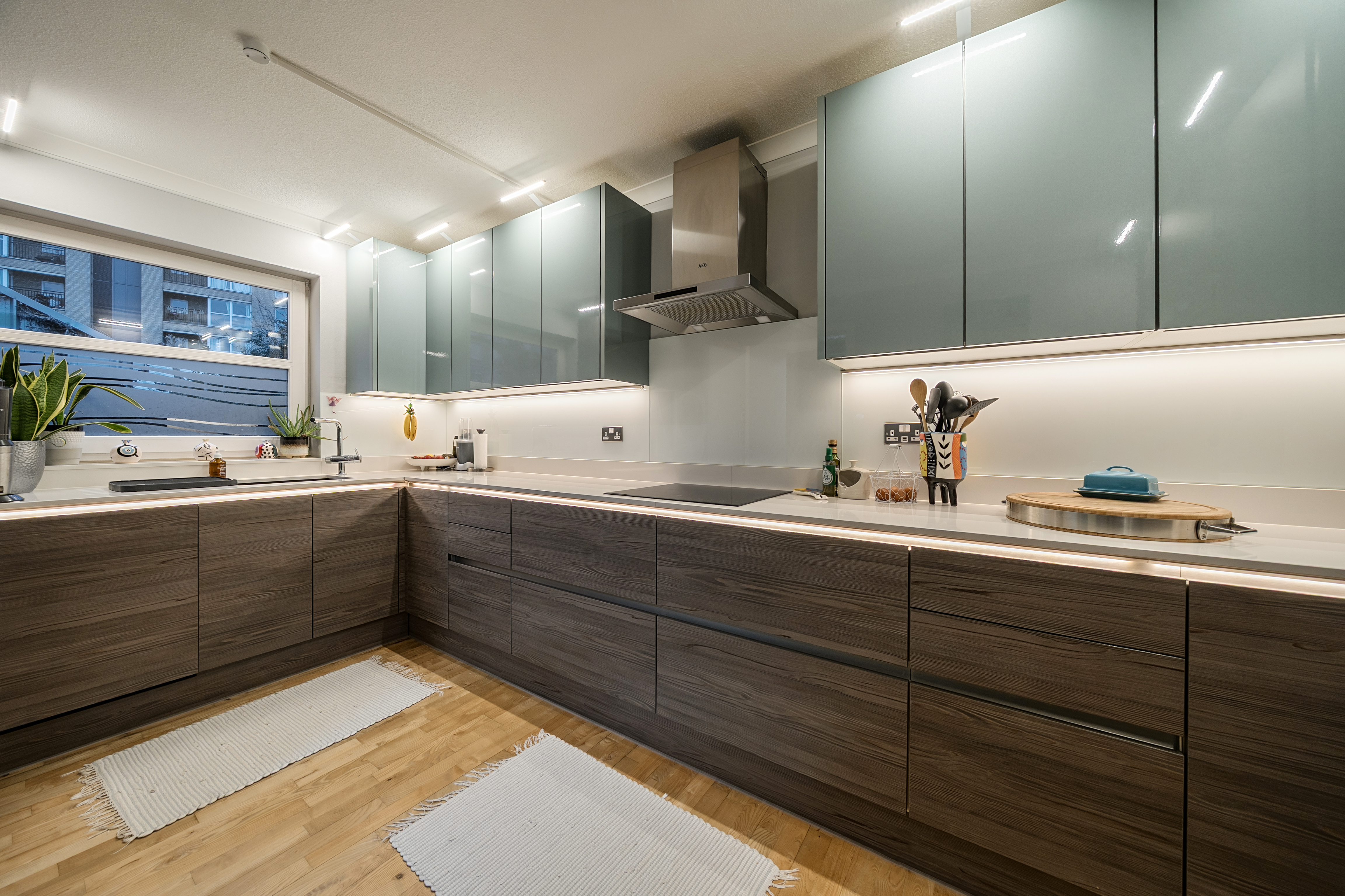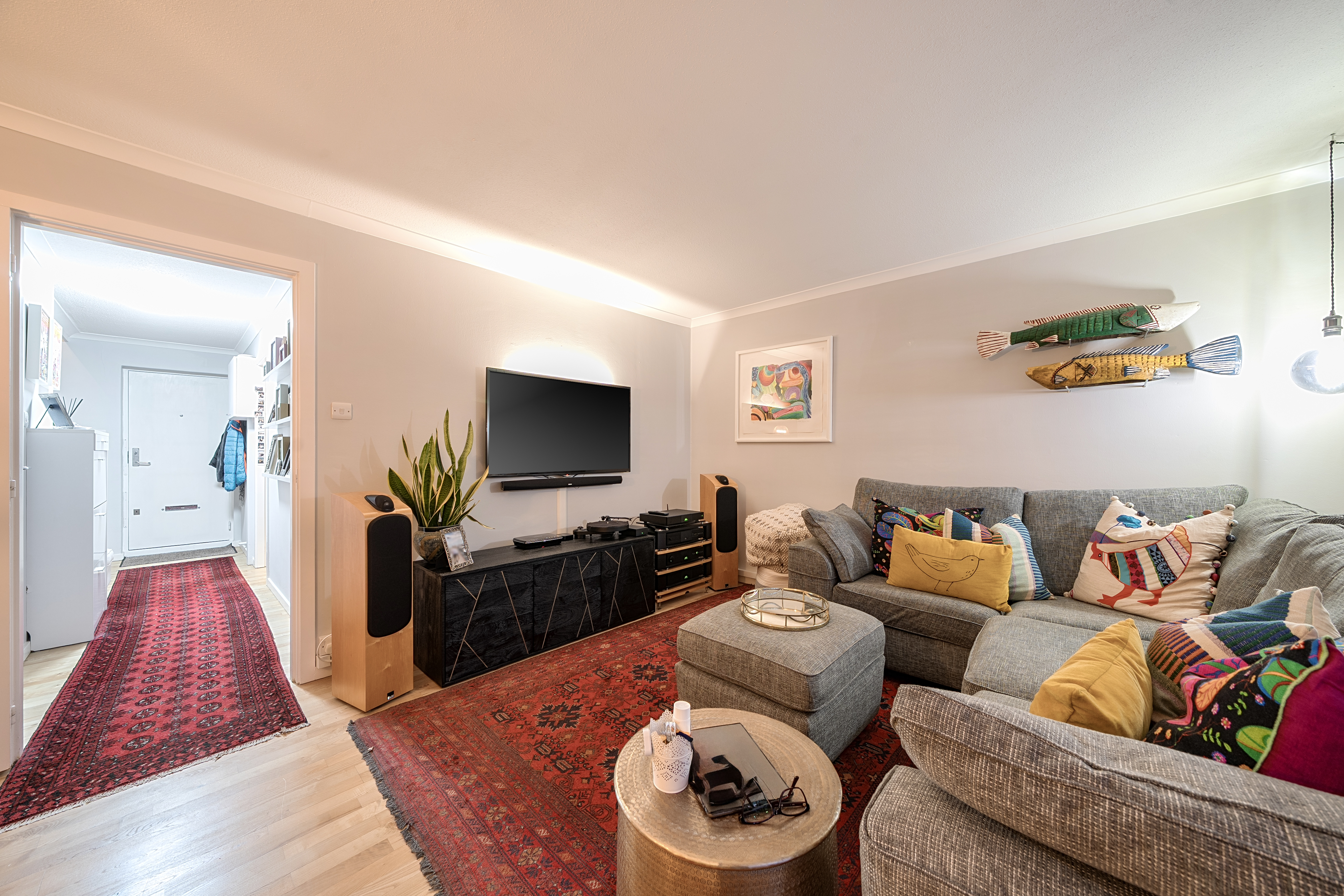 Presented in immaculate, owner-occupied condition, the property has been comprehensively upgraded and is truly turnkey, with no onward works required. The recently renovated kitchen has been finished to a high standard, featuring contemporary cabinetry, integrated AEG appliances and sleek worktops, alongside a fitted filter tap for added convenience. Both bathrooms have also been stylishly modernised with quality fittings and clean, modern finishes. Natural solid wood flooring runs throughout the living areas, adding warmth and character, while LED lighting enhances the bright, energy-efficient ambience.