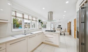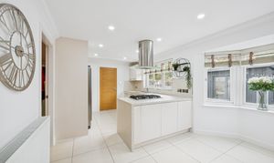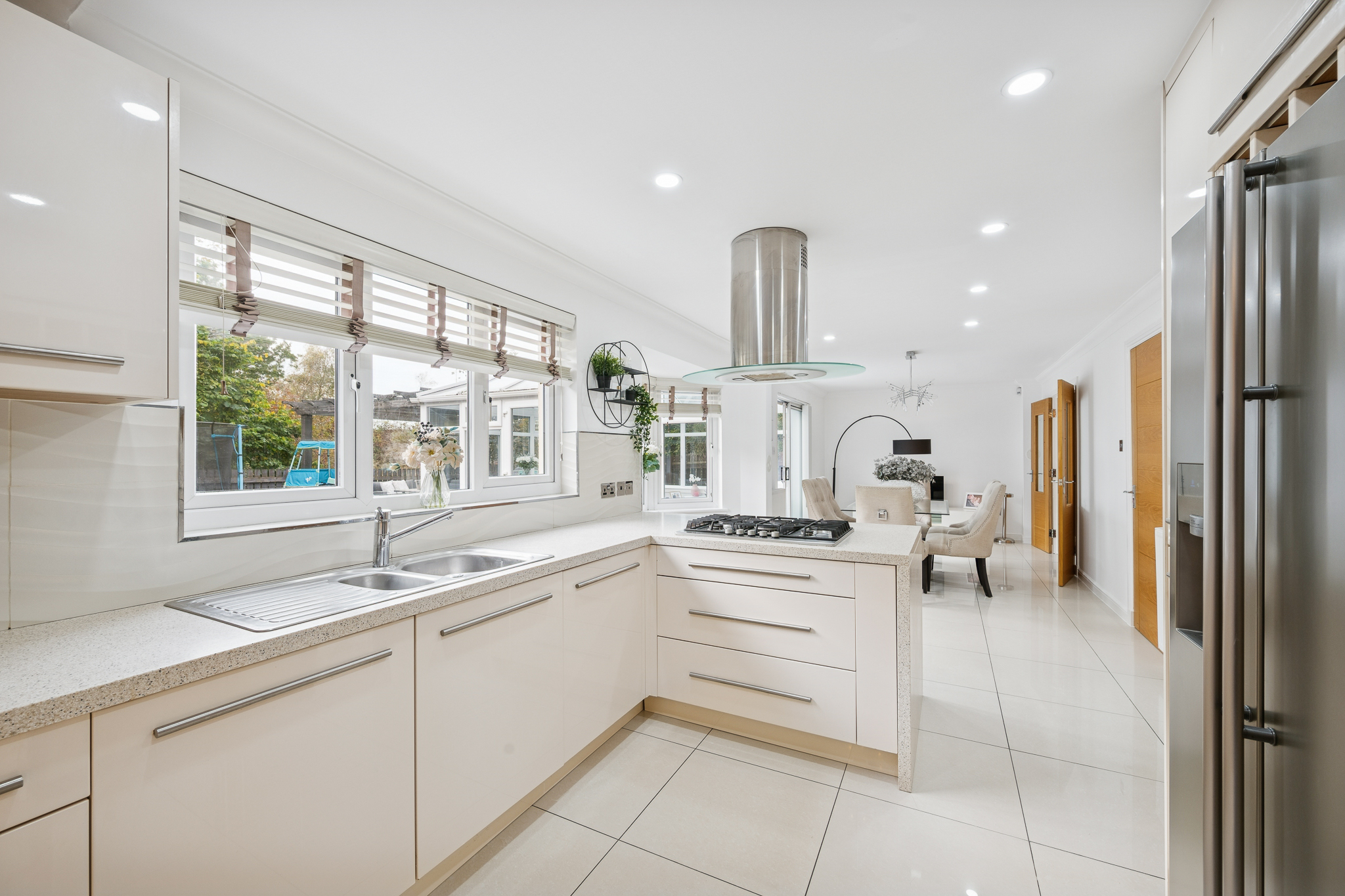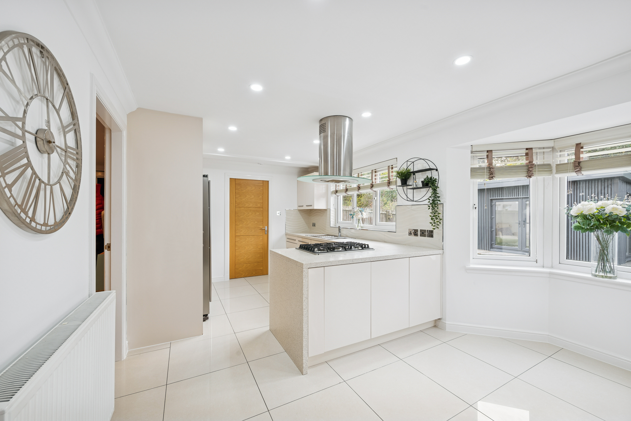 To the front, the property sits gracefully on a corner plot with a four-car driveway and a beautifully maintained exterior that enhances its sense of exclusivity and space.