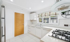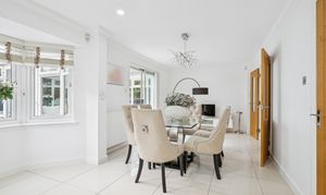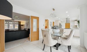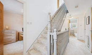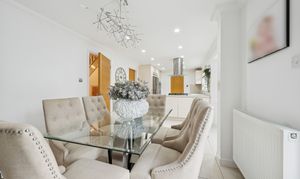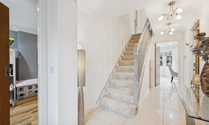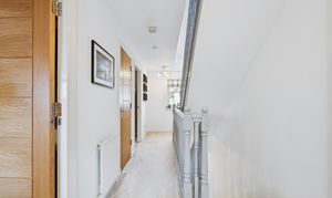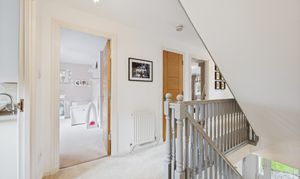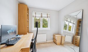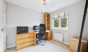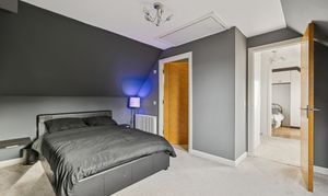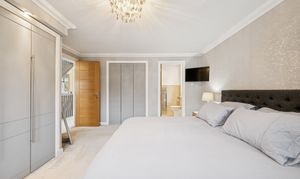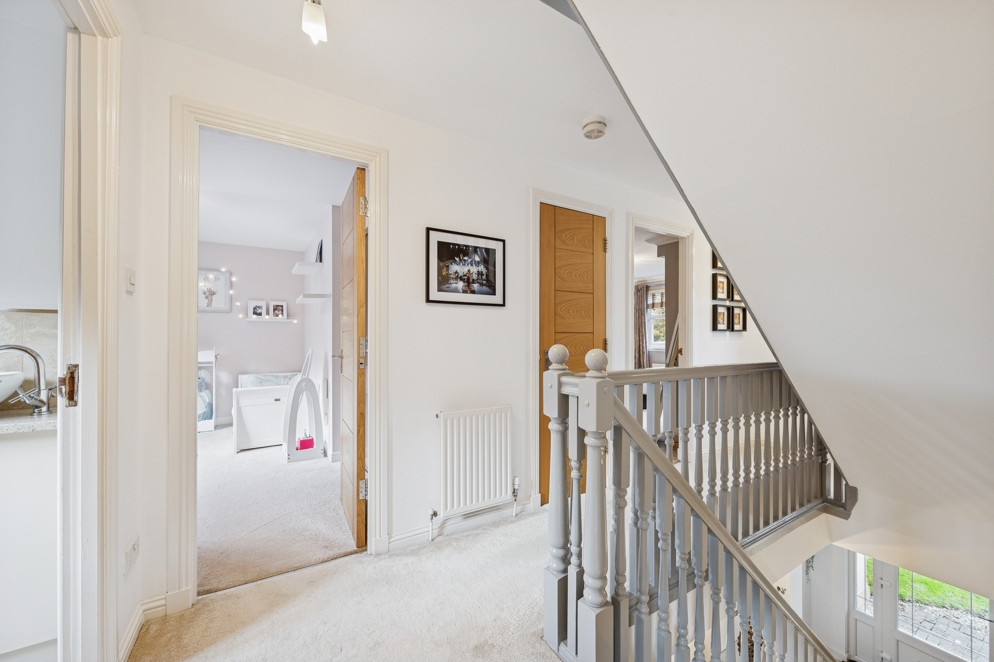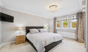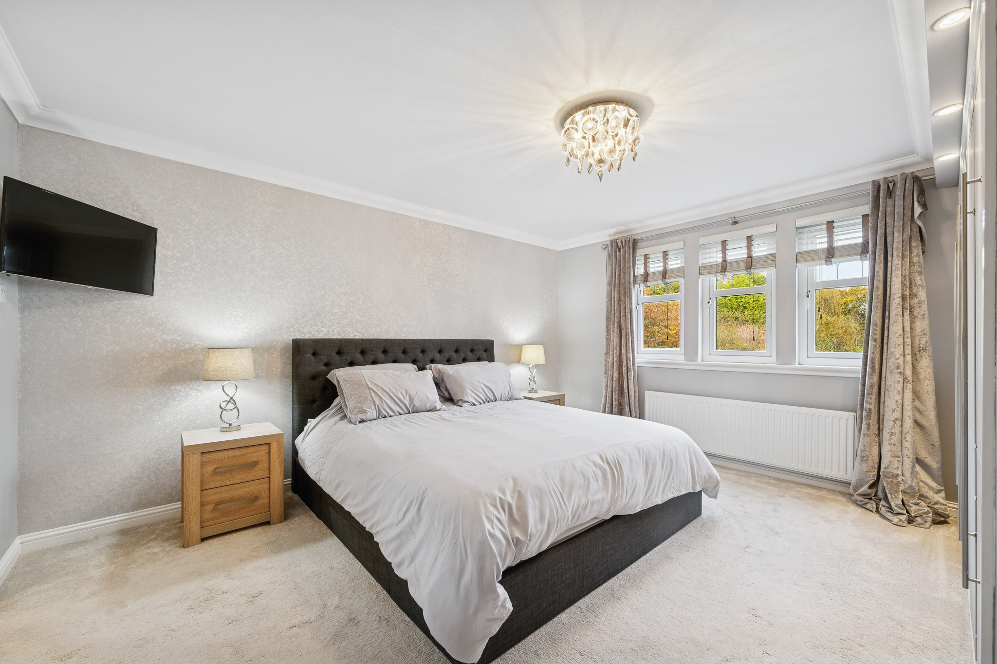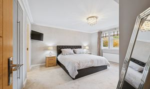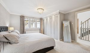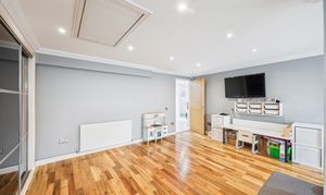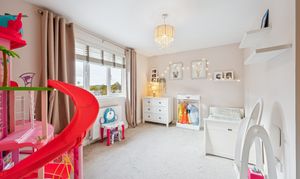 Upstairs on the first floor, you’ll find four beautifully proportioned bedrooms. The principal bedroom is a luxurious retreat, comfortably accommodating a super king-size bed with bedside cabinets and featuring two large fitted wardrobes. Its private en-suite offers a three-piece suite with a standing shower, chrome heated towel rail, and half-height tiling, elegant and functional. Bedroom three and bedroom five both benefit from generous space for a double or king-size bed, while bedroom three, currently a nursery, offers flexibility to serve as a guest bedroom or home office. The family bathroom on this level features a modern three-piece suite with a bathtub, chrome towel rail, and half-wall tiling.