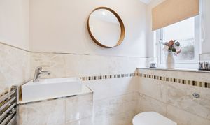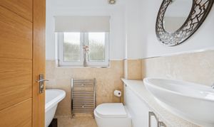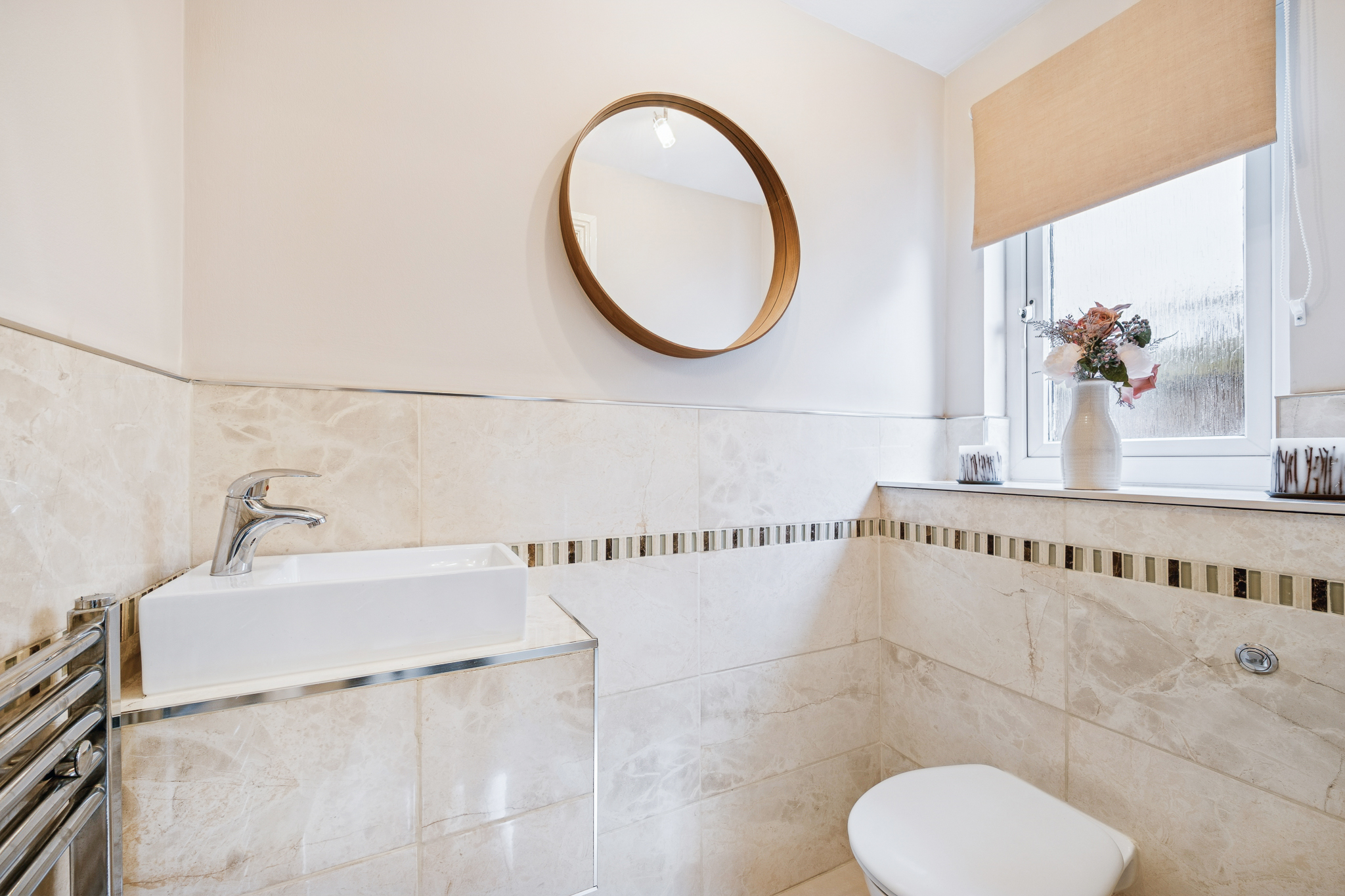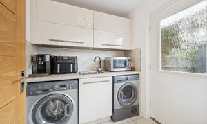 Completing the ground floor is a utility room with space for a washing machine and tumble dryer, a two-piece WC with chrome fittings and half-wall tiling, and useful under-stair storage for everyday essentials.