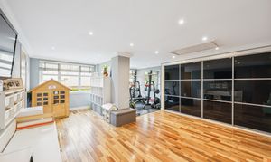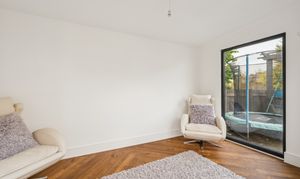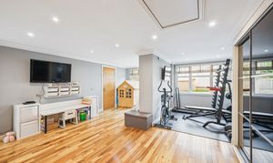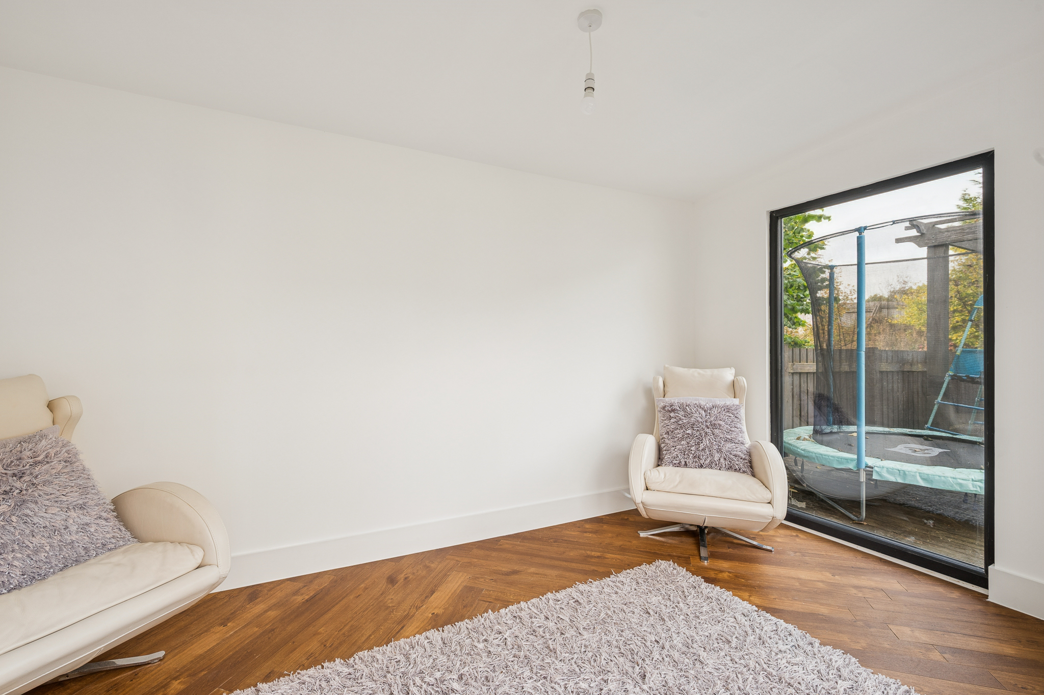 To the left, the converted double garage offers incredible flexibility. Currently used as a home gym, this expansive space with laminate flooring and front-facing windows could equally serve as a second lounge, playroom, office, or even a studio, an adaptable room tailored to modern family life.