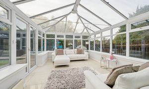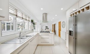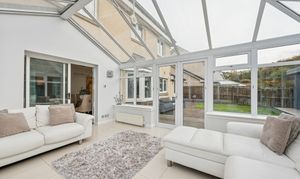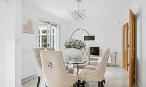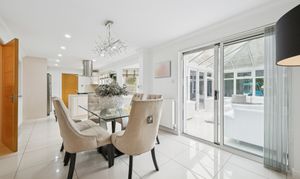 At the rear of the home, the open-plan kitchen and dining area spans the full width of the property, creating the perfect hub for family gatherings and entertaining. The kitchen is fitted with ample worktop space, a five-point gas cooker with extractor fan, integrated oven, dishwasher, and space for an American-style fridge-freezer. Adjacent is a generous dining area that can easily accommodate six to eight guests and features a charming bay window overlooking the rear garden. From here, double doors lead through to the conservatory, an additional living space ideal for relaxing, which opens directly onto the garden through French patio doors.