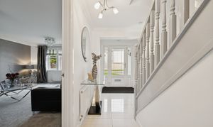 As you enter, you’re greeted by a bright and spacious hallway that immediately showcases the home’s generous proportions. To the right-hand side, the lounge offers an inviting retreat, featuring a central media wall, a large front-facing window flooding the room with natural light, and space to comfortably host two large sofas and additional furnishings, perfect for relaxing or entertaining guests.