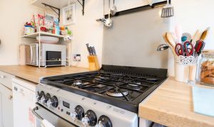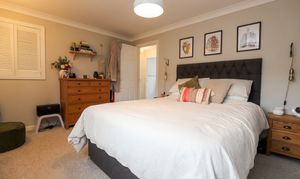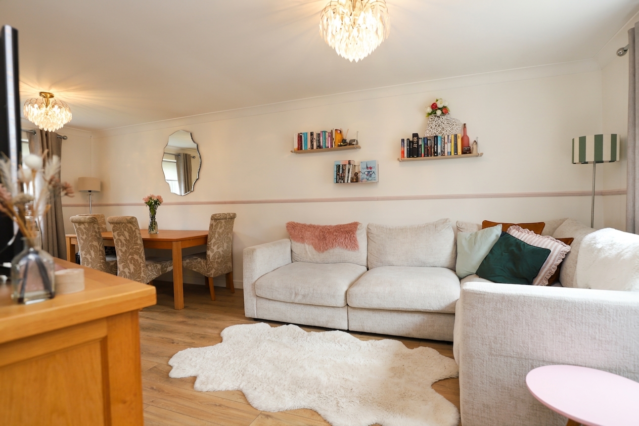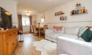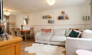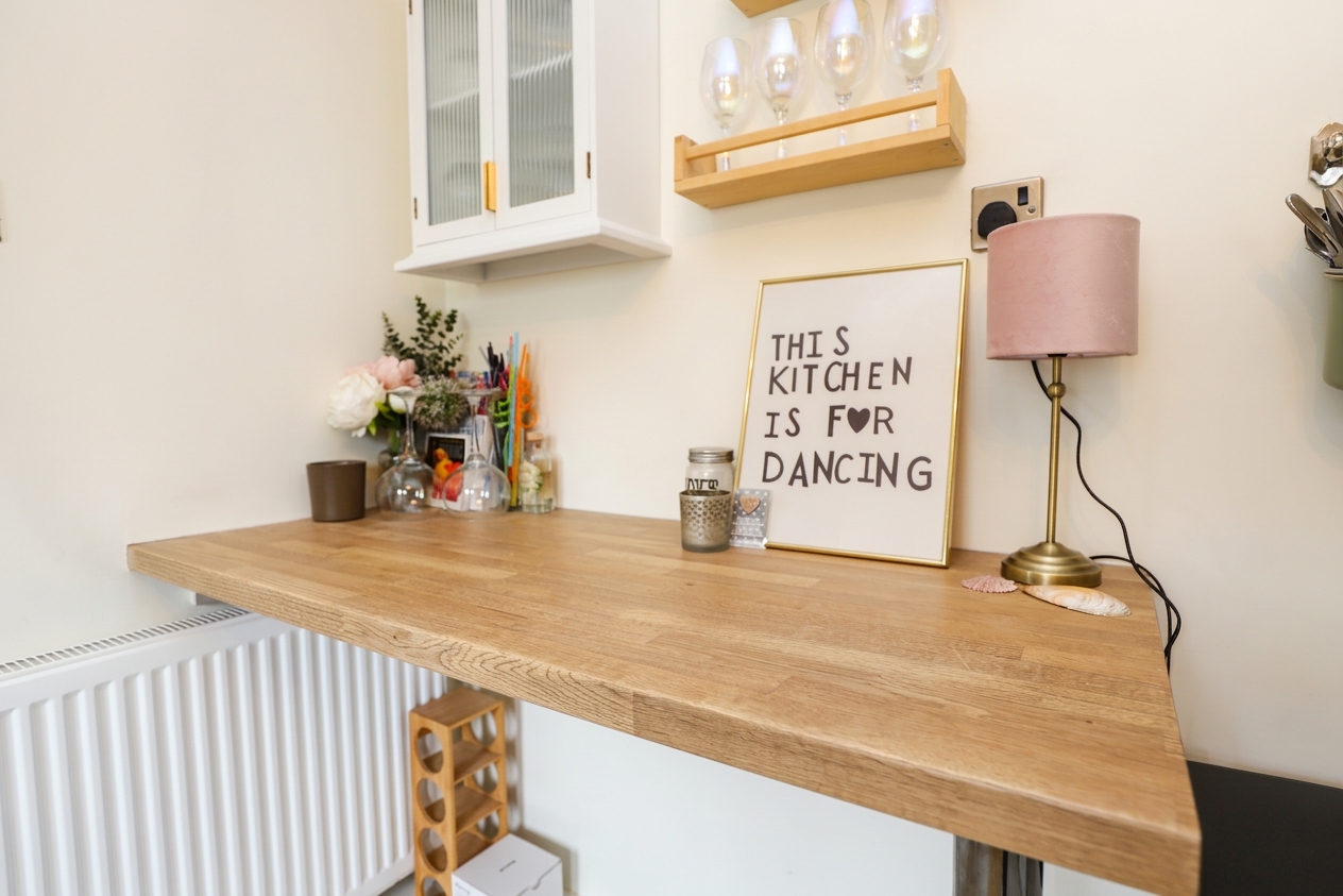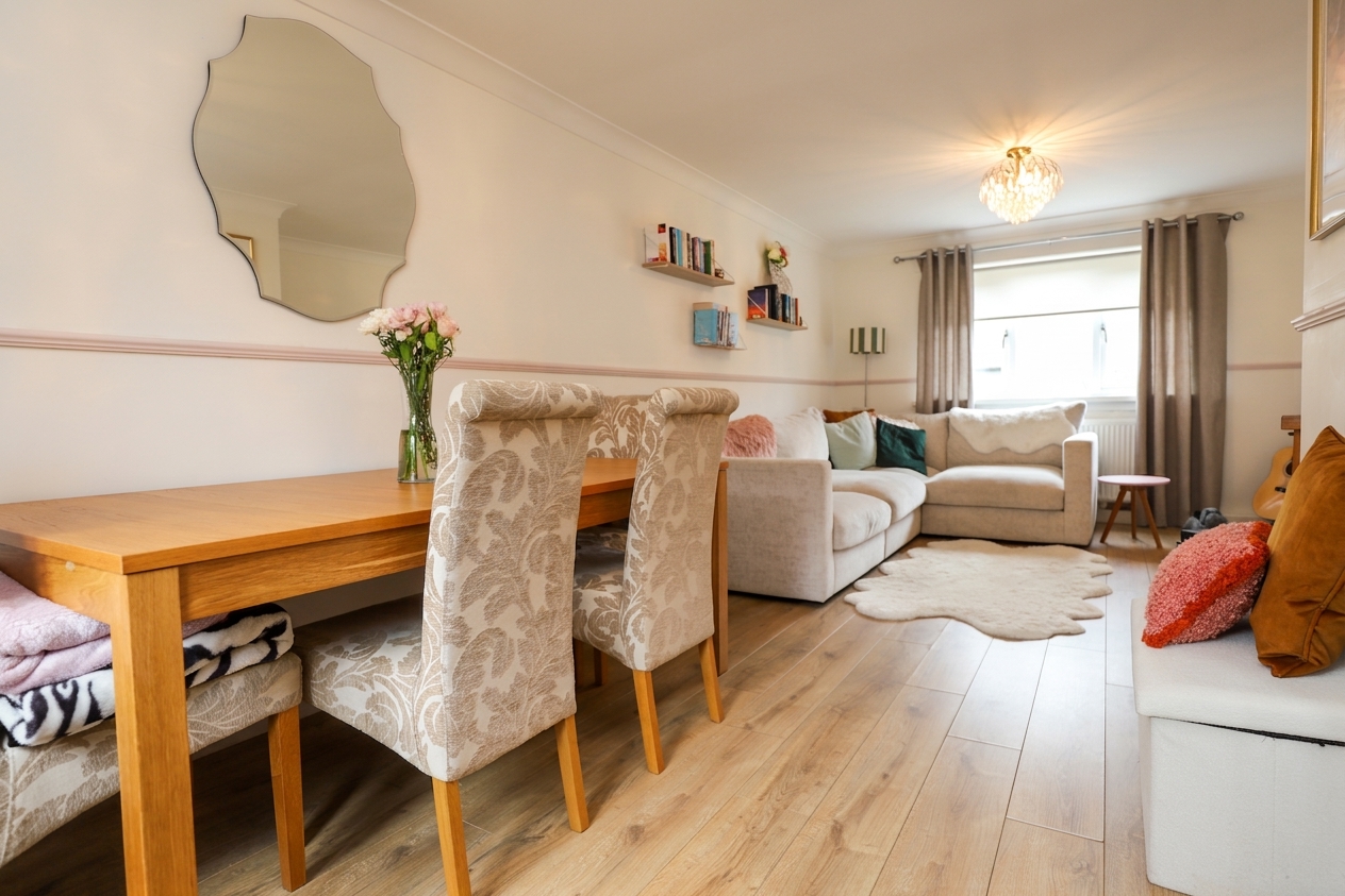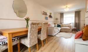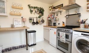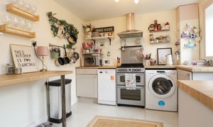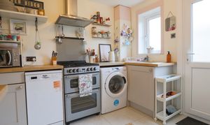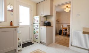 The thoughtfully designed kitchen, accessed directly from the dining space, features a suite of integrated appliances, base storage units, and generous worktop space, making it both a practical and stylish hub for culinary creativity.