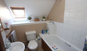 Velux to front. Pedestal wash hand basin. Low level WC. Panelled bath with mixer shower over, and telephone style shower attachment. Partially tiled walls.