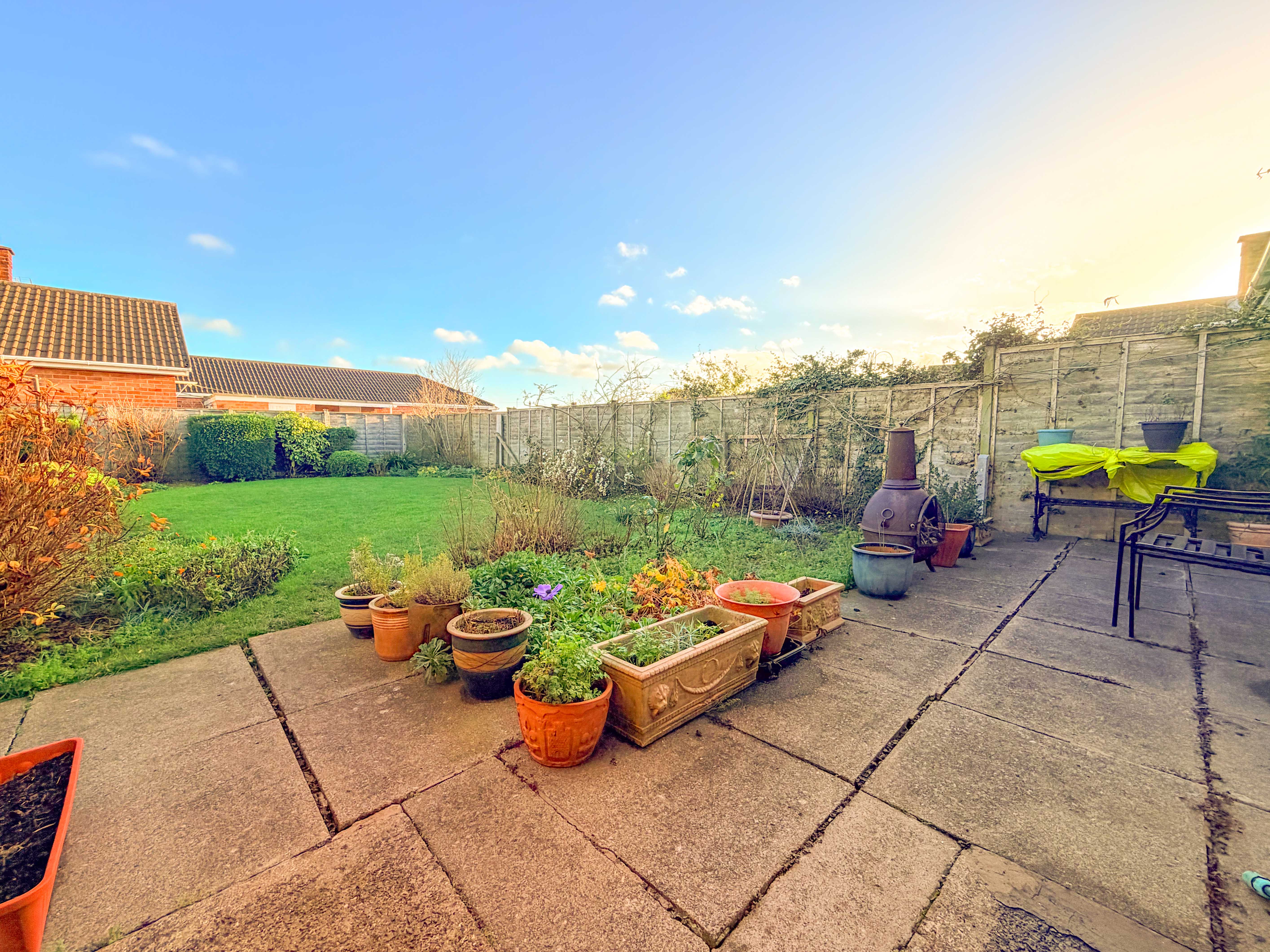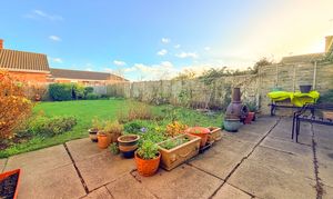 The rear garden provides a pleasant outdoor retreat, with a paved patio ideal for seating and dining, leading onto a lawn with well-tended borders.