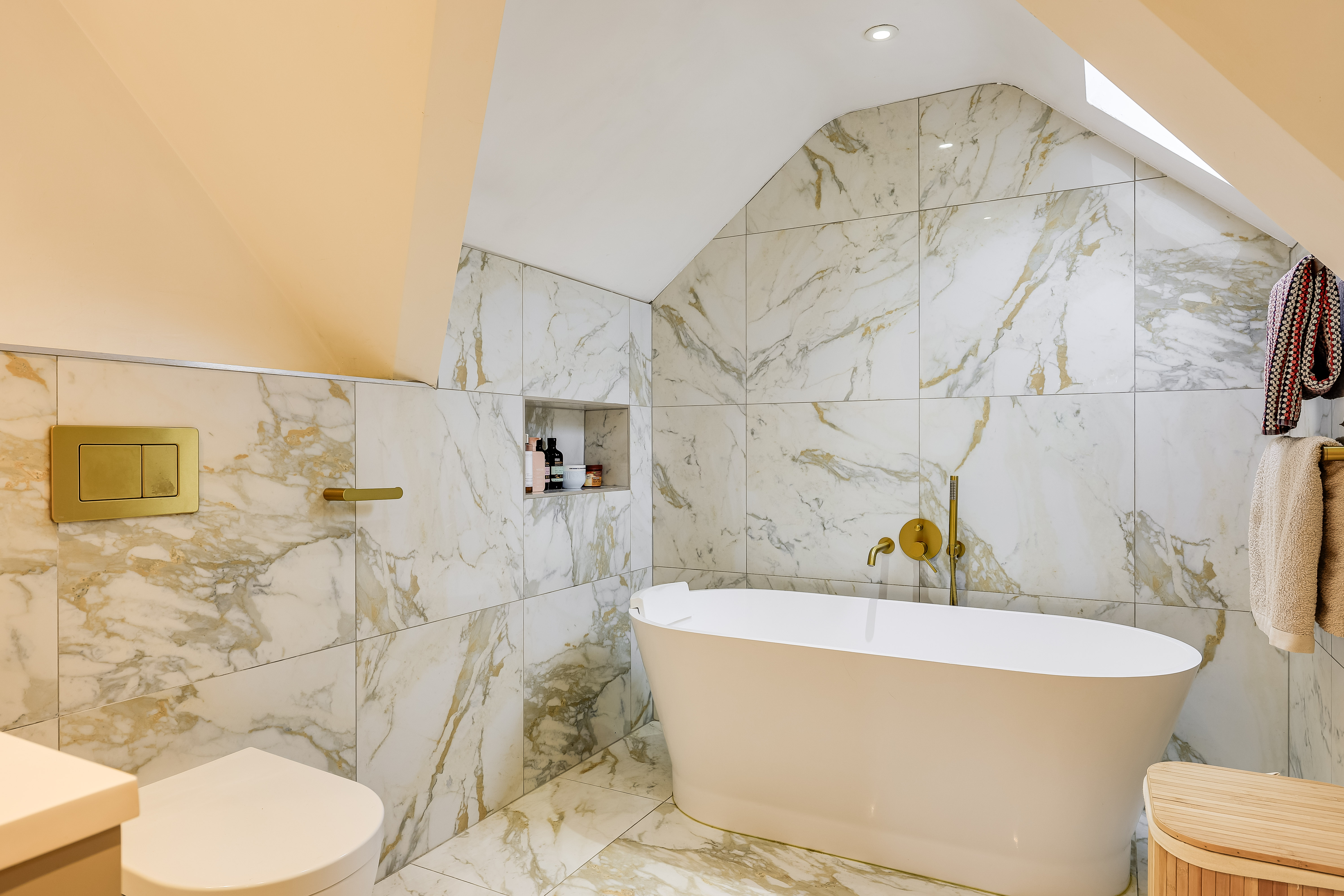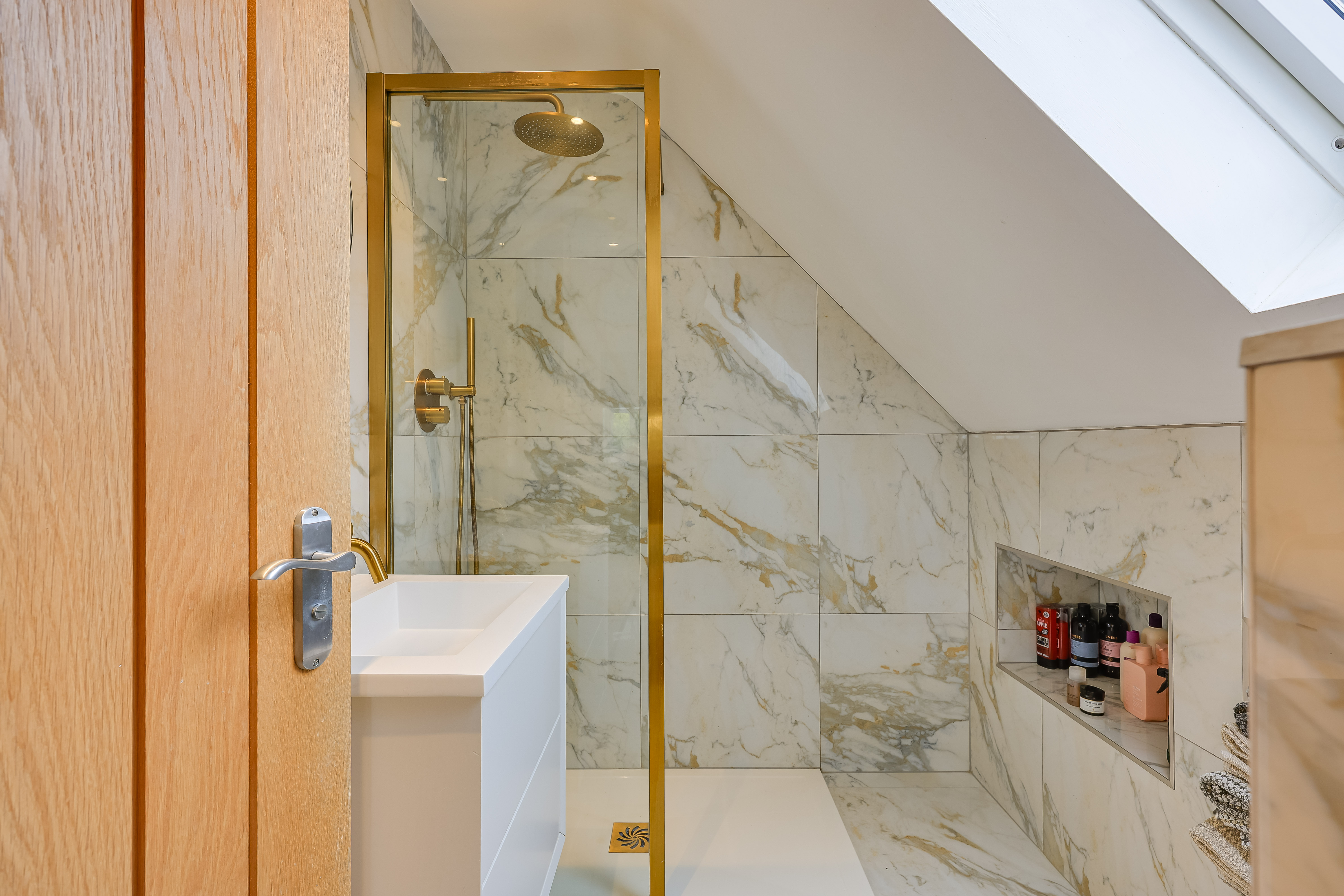 At the heart of the home lies an open-plan kitchen/dining/family room — a wonderful space designed for both everyday living and entertaining. The recently hand made contemporary kitchen with Italian marble work surfaces combines timeless design with modern convenience, featuring high-quality fittings, ample storage, and a seamless flow into the dining and family areas. Bi-fold doors open directly onto the rear garden, effortlessly connecting indoor and outdoor living spaces.