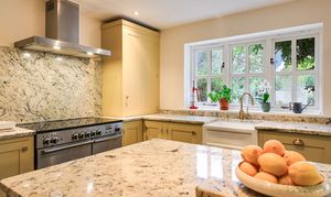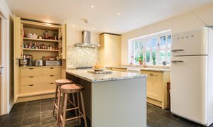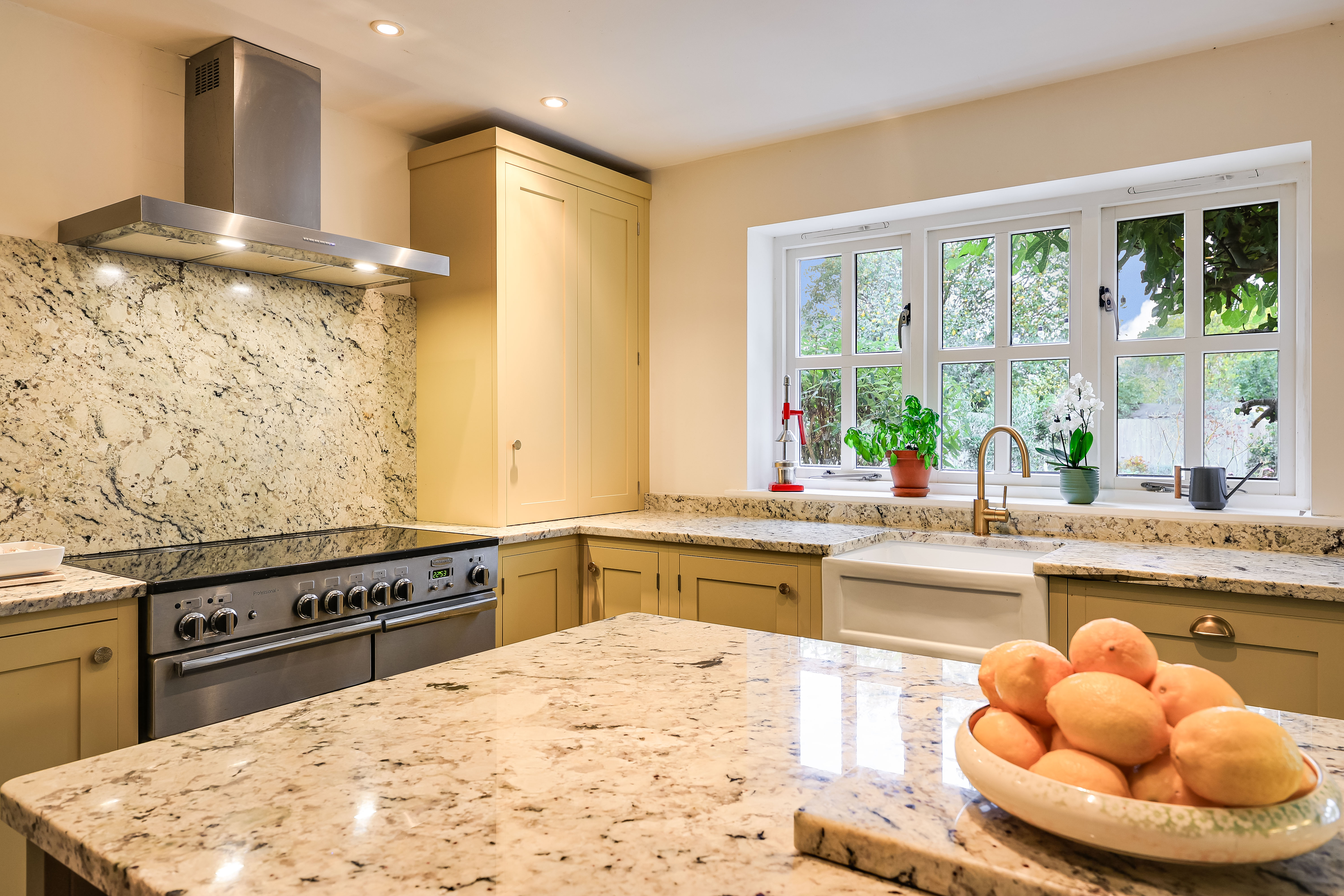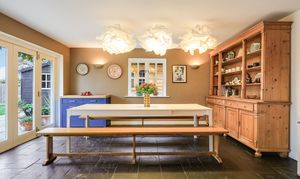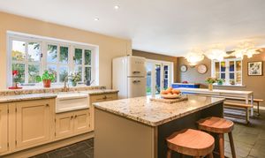 - Impressive open-plan kitchen/dining/family room with hand made comtemporary kitchen, finished in Farrow & Ball colours, topped with Italian marble surfaces