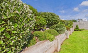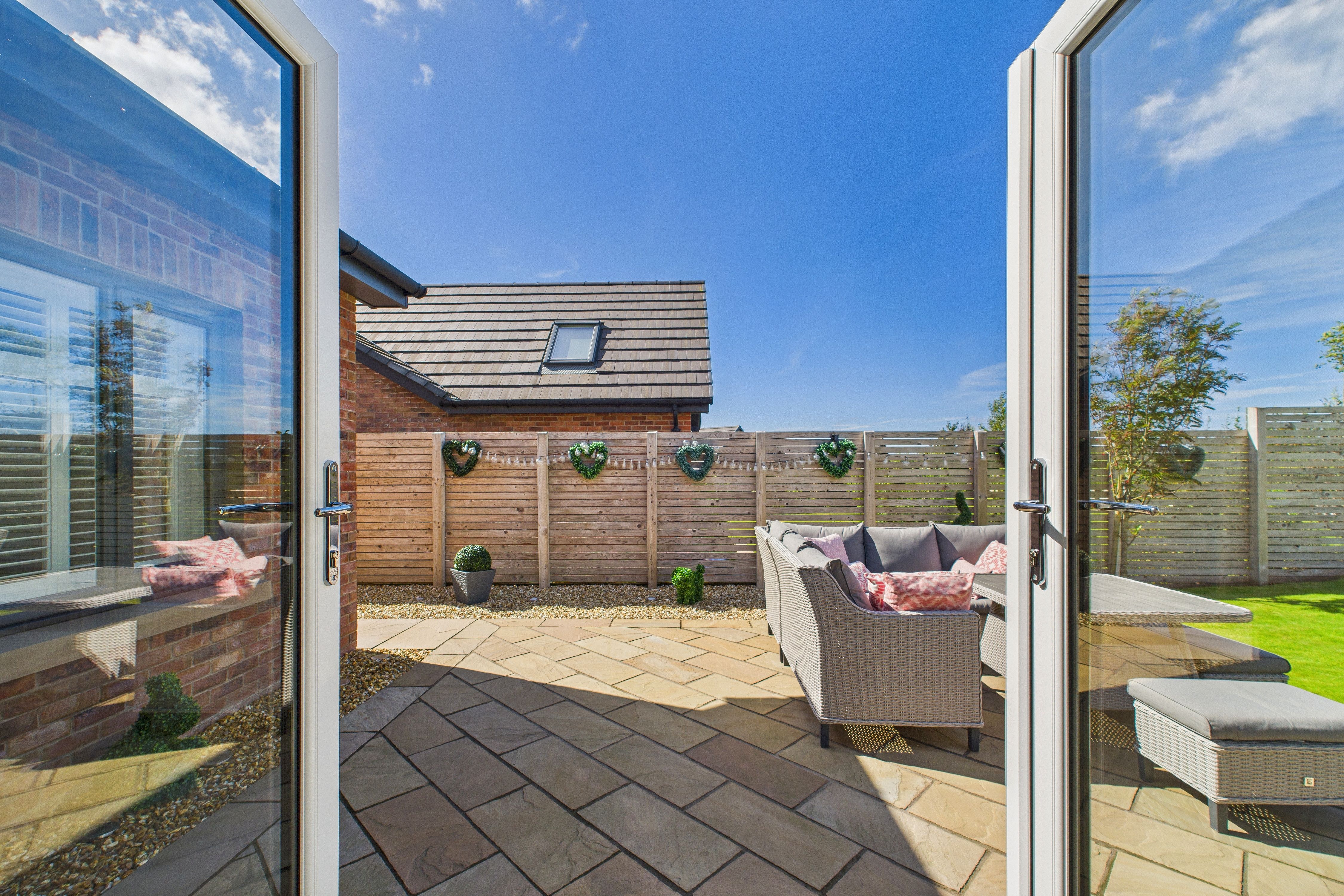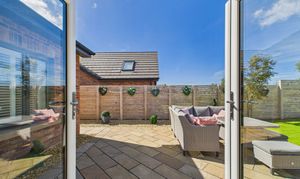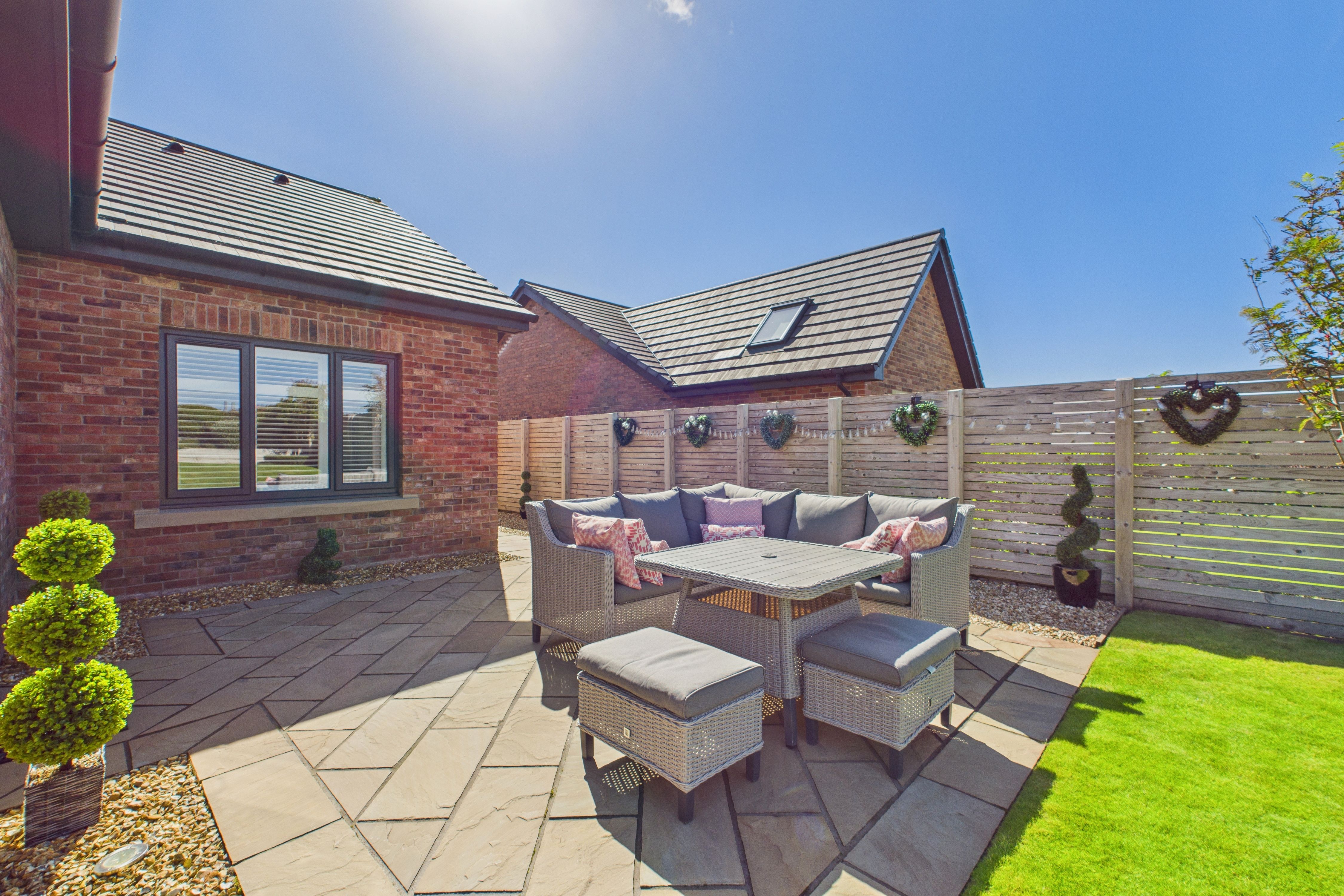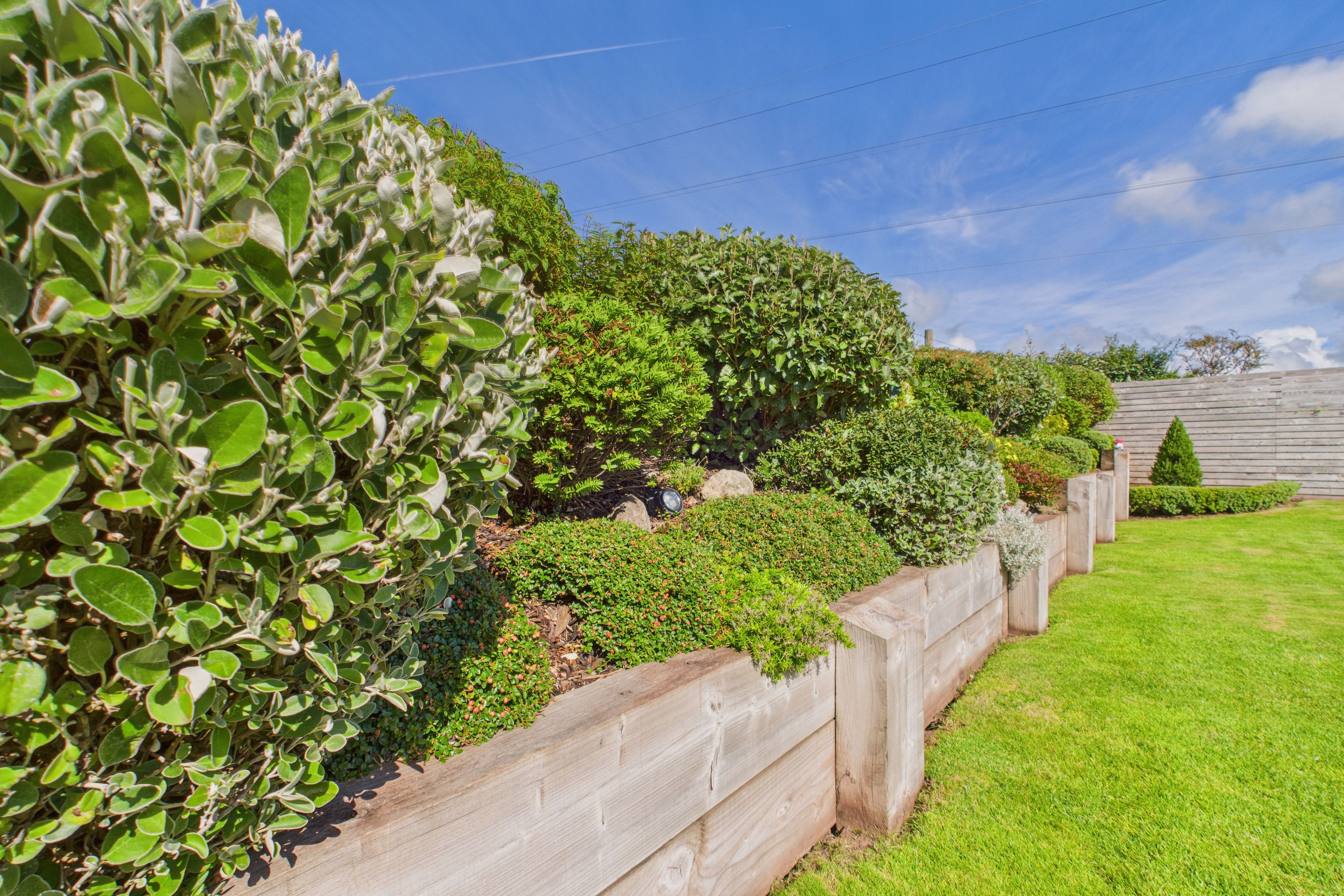 Outside, a spacious driveway leads to a private, sun-soaked garden with a large patio, perfect for outdoor entertaining or peaceful relaxation. The garden, largely laid to lawn, is bordered by mature shrubs, plants, and trees, creating a serene oasis just waiting to be enjoyed.