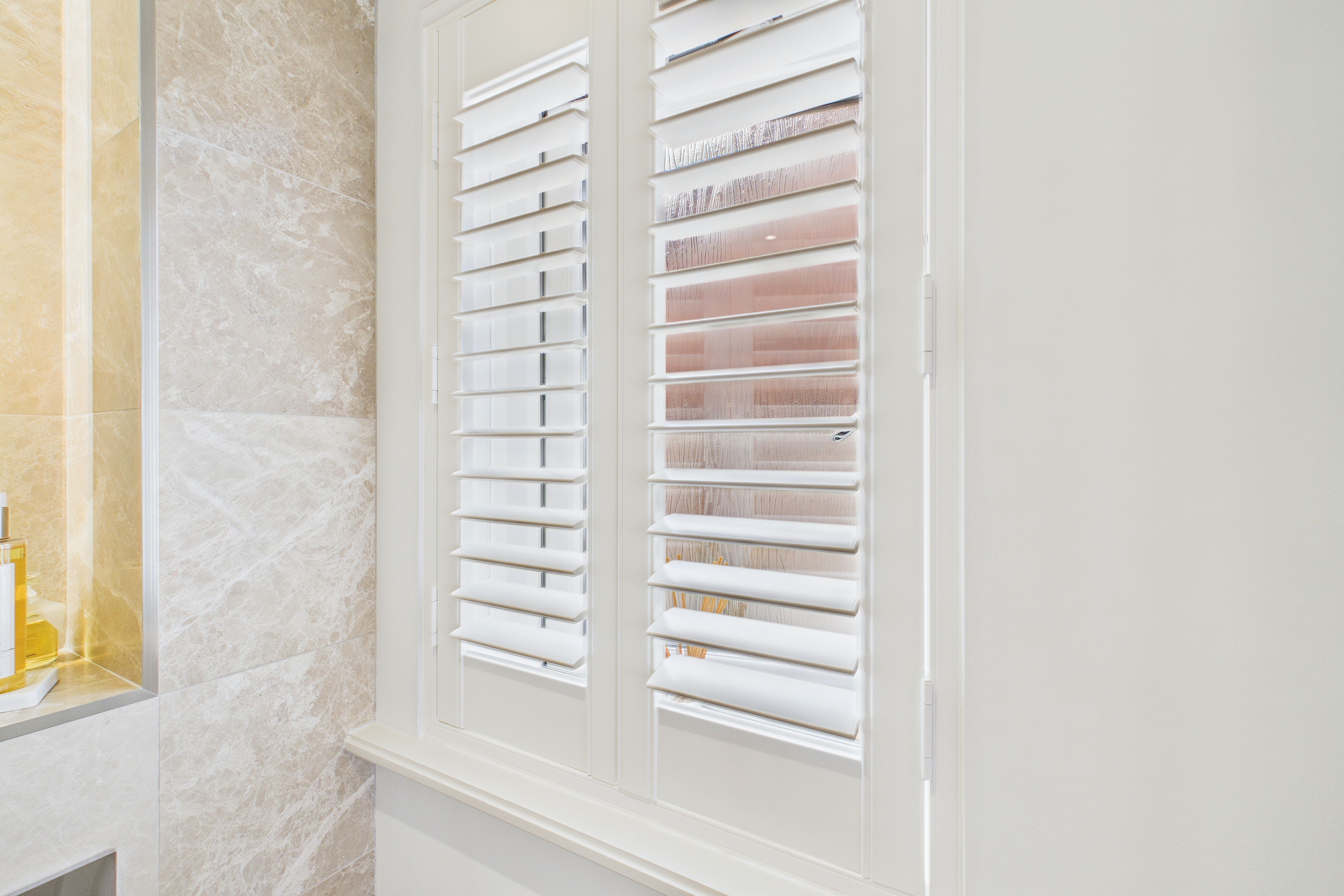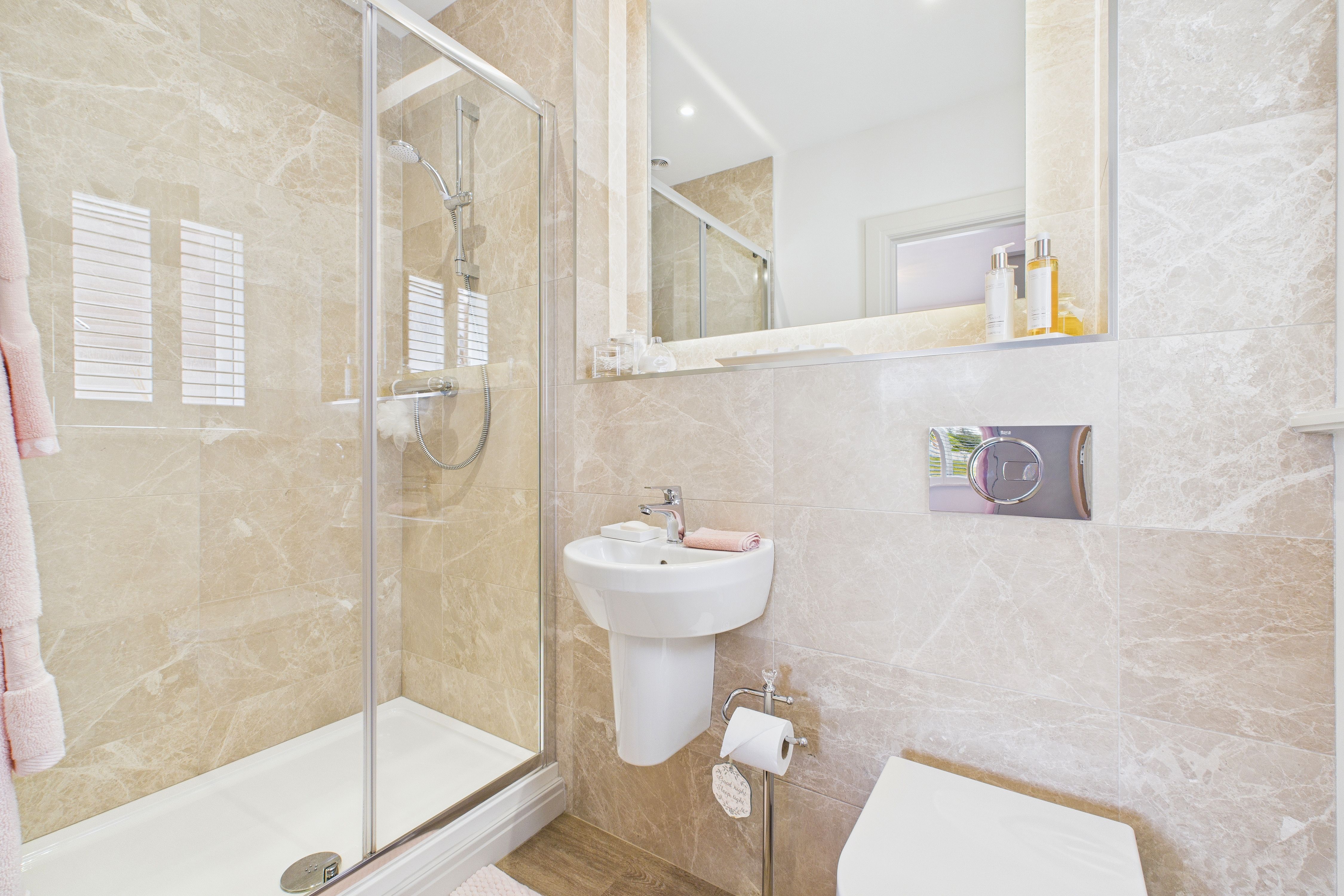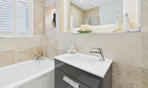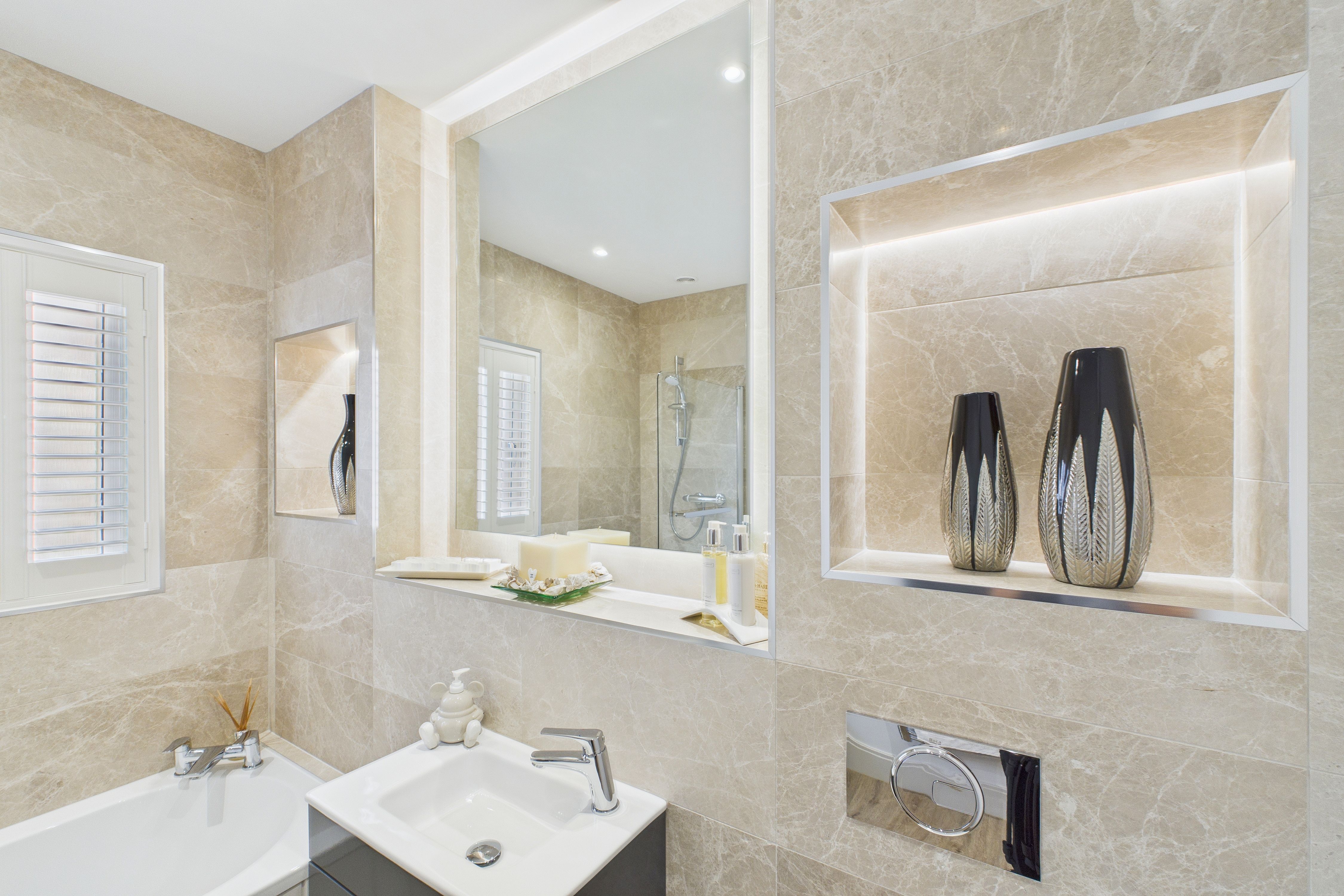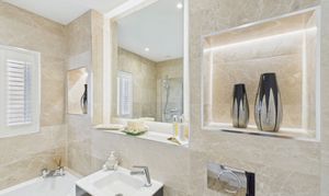 - Elegant family bathroom and ensuite shower room, both featuring alcoves with integrated lighting and boasting beautiful shutters