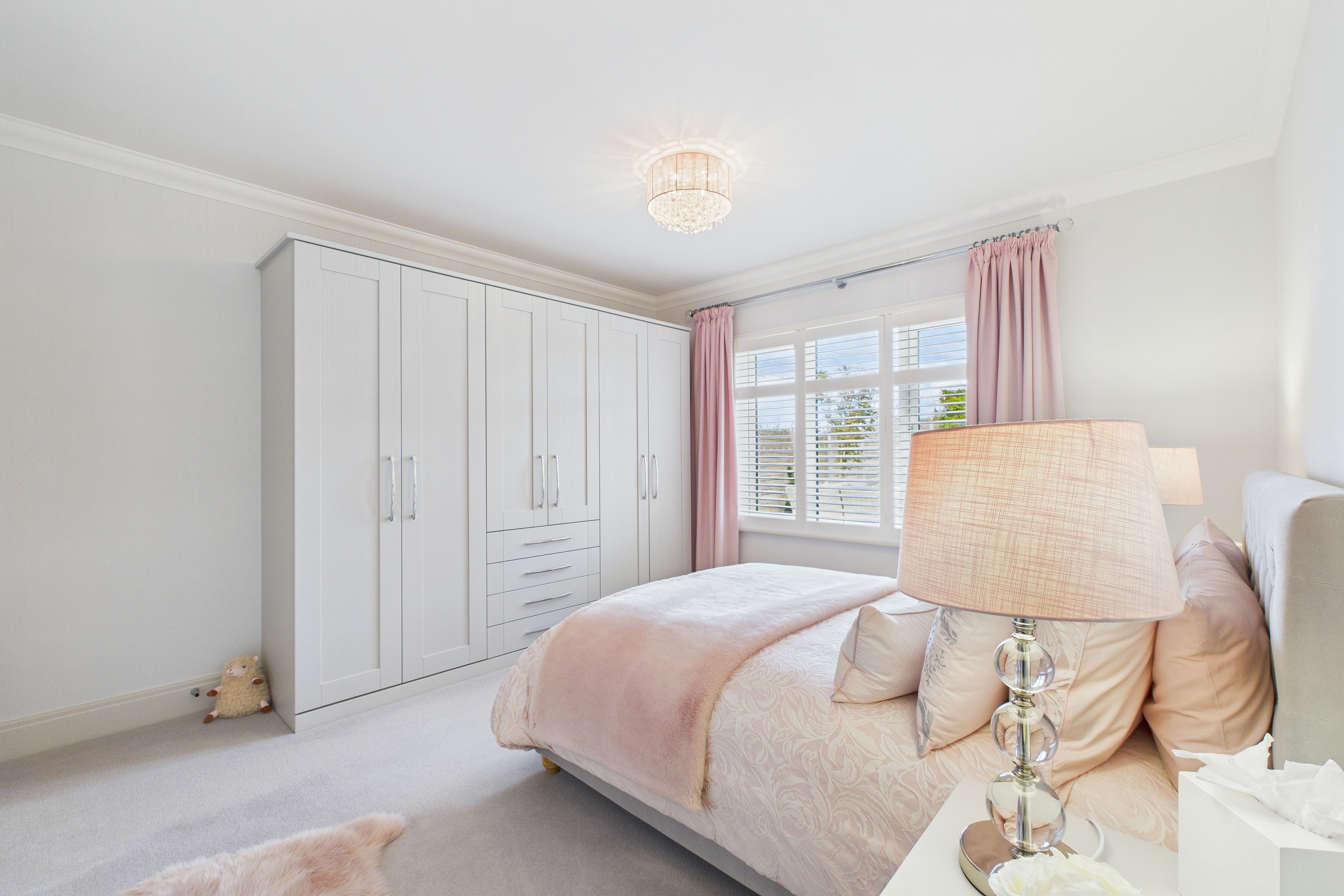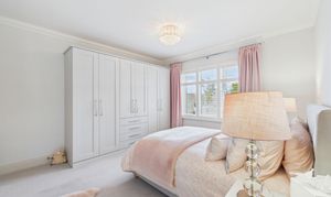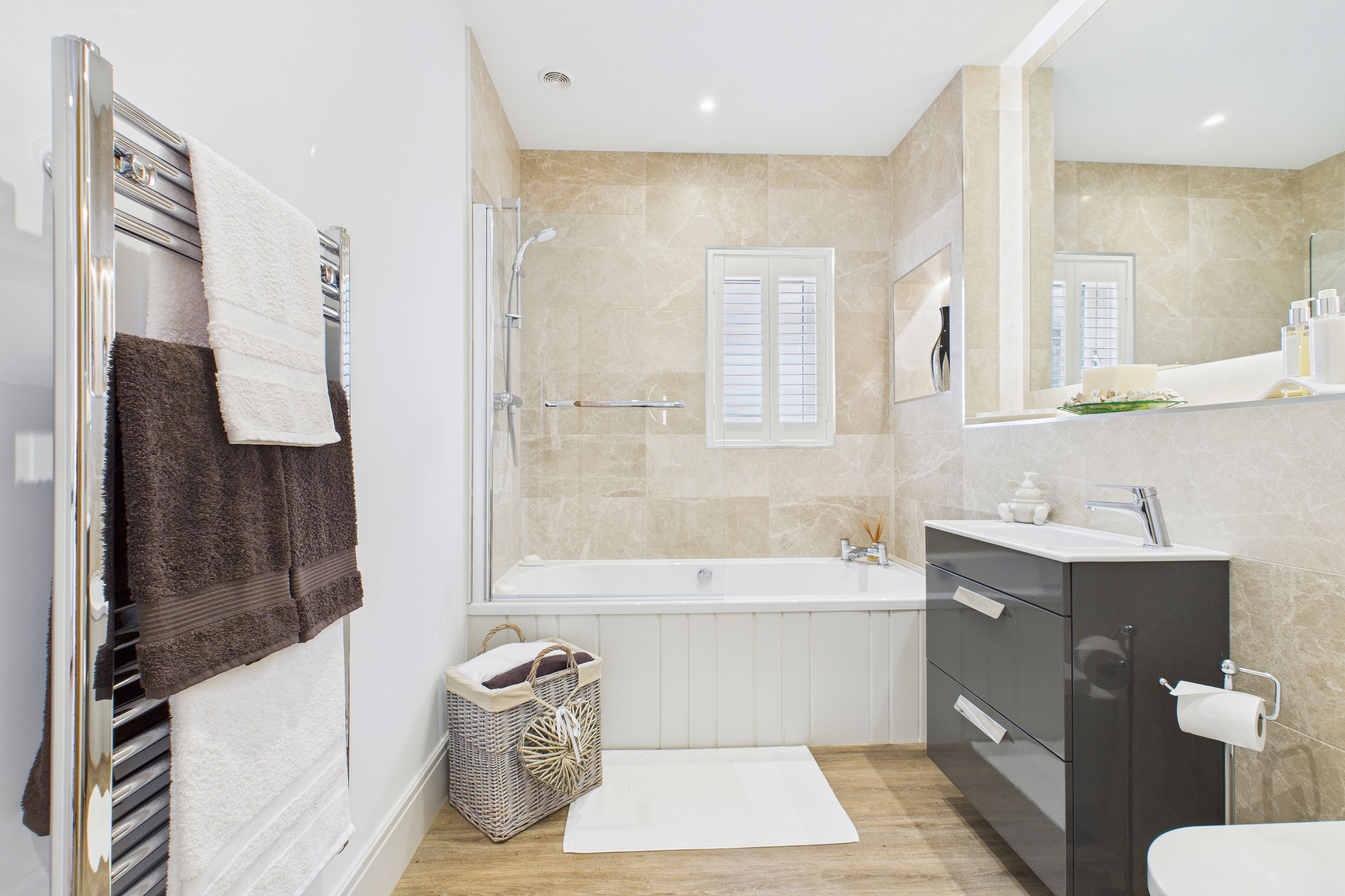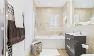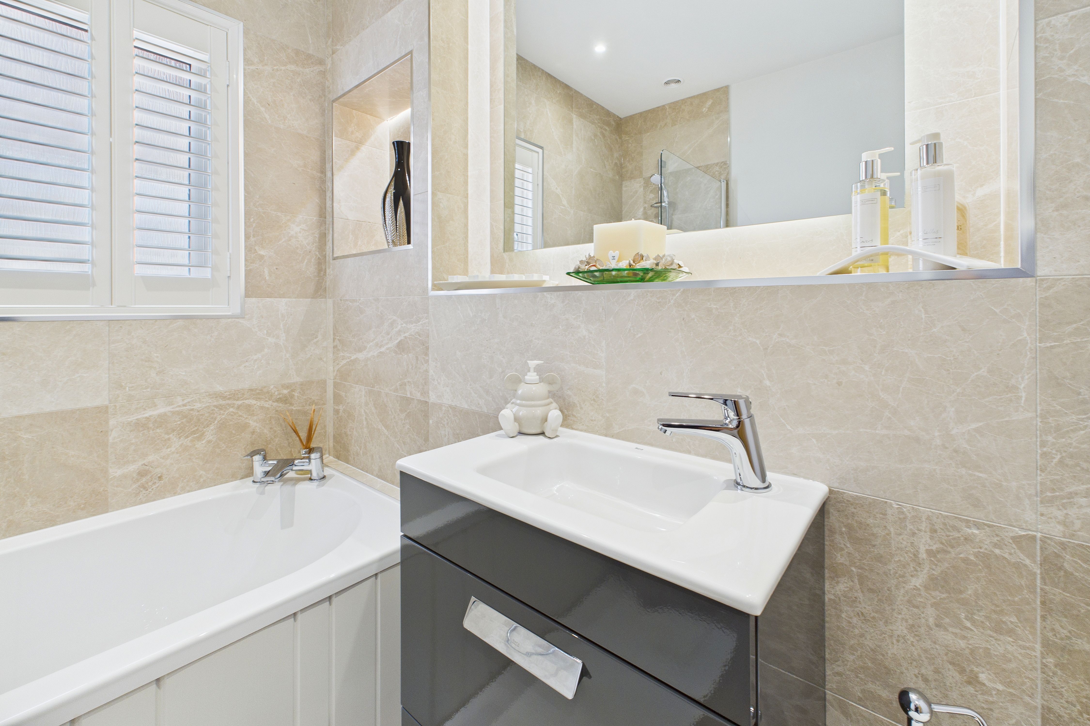 - Elegant family bathroom and ensuite shower room, both featuring alcoves with integrated lighting and boasting beautiful shutters