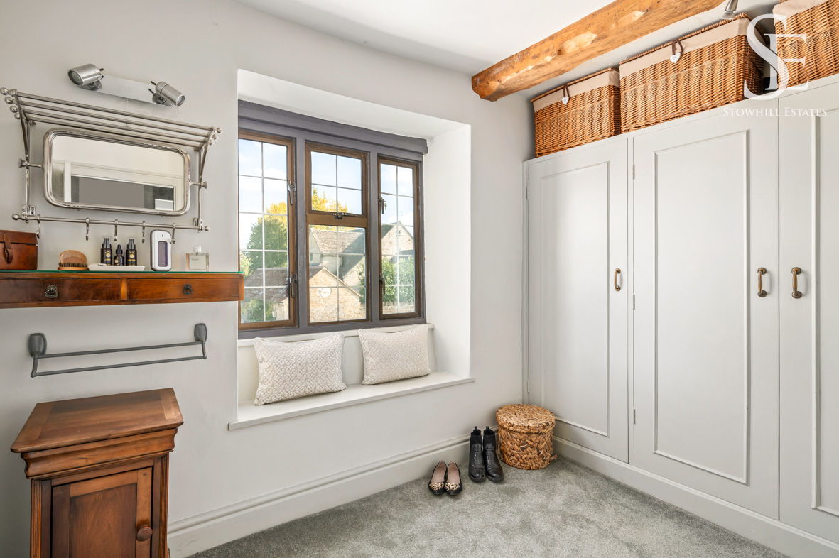 Turning right at the top of the landing, built-in wardrobes in soft green-grey provide plenty of storage in the dressing room, ideally located across the landing from the principal suite, itself brimming with built-in wardrobes.