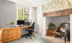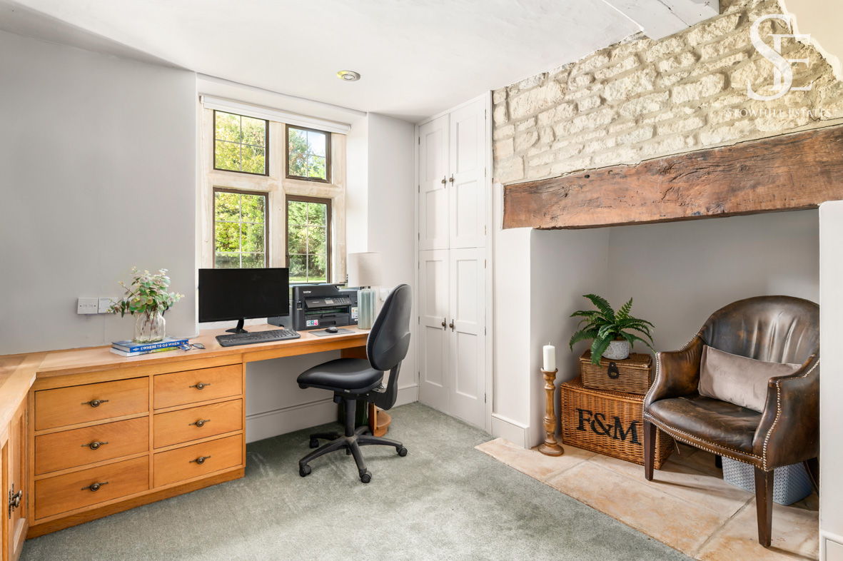 A versatile home, with space for family, leisure and focus, also opening up from the entrance hallway is a peaceful study, perfect for those working from home. A rustic beam extends above the open fireplace, with built-in cabinetry in muted modern shades tucked into the alcoves to either side, and a corner desk nestled beneath a tall window framing views out over the large garden, whose privacy is preserved by a tree-lined boundary in the distance.