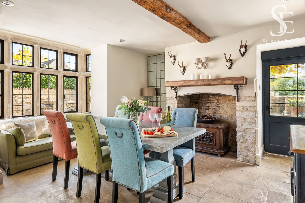 Flagstone flooring flows underfoot in the dining room to the left, where a stone inglenook fireplace and exposed beams infuse character, and stone mullion windows with leaded panes draw in light from the front. An atmospheric room for feasting with family and friends, the dining room is ideal when company calls, with space for a sofa in the bay window, with a door opening out to the patio, perfect for al fresco dining in the summer.