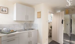 Wooden flooring runs underfoot on the ground level, with a stylish and sophisticated contemporary kitchenette replete with sink, fridge and breakfast bar offering access out to a private courtyard garden. Exposed brickwork evokes the annexe’s barn origins, visible in the open and airy living-dining room, where glass balustrade stairs lead up to a beautiful bedroom beneath the vaulted, whitewashed beams of the mezzanine level.