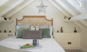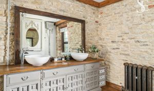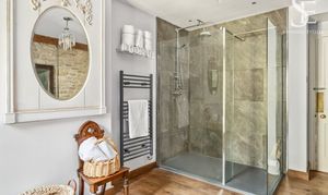 Refresh and revive in the en suite, a capacious room, with exposed stone walls, wooden flooring, cast iron radiator and bespoke vanity unit with twin wash basins. Step into the large walk-in shower to freshen up, replete with rainfall head and a handy nearby heated towel radiator in charcoal tones.