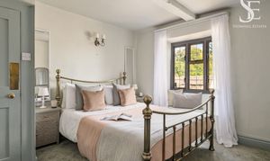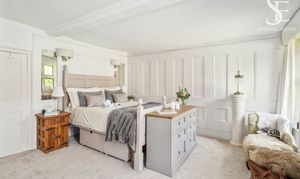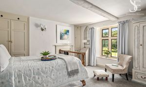 Next door, a second double bedroom is dressed in similar shades and offers fantastic views out over the garden and pond, again featuring built-in wardrobes and with an ornamental fireplace. Interior designer-led in its styling throughout, there is a soothing yet elegant finesse to all the rooms at Warrens Cross Farm.