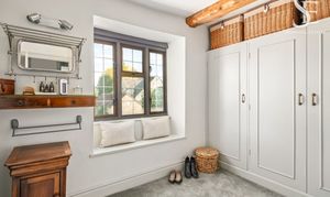 Pumping out warmth and cheer, the Rangemaster oven is a natural congregational point, nestled in a rustic whitewashed stone surround. Muted, soft blue-grey Shaker-style cabinetry adds a heritage feel to this modern kitchen, where storage is available in abundance and crisp white worktops provide plenty of preparation space. Newly fitted within the last 24 months, this fresh feel kitchen also includes a host of fitted appliances, including sink, fridge and dishwasher. Dine casually at the breakfast bar, with the handy utility room close by providing further storage and a second sink, space for a separate fridge and abundant storage. From here, a front porch leads out to the garden and with built-in dog bed area and cupboards, this utility room serves just as well as a boot room for everyday comings and goings.