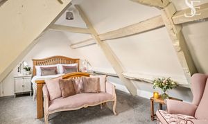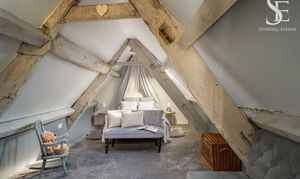 Two further double bedrooms also feature on the top floor, one with whitewashed vaulted ceiling, Velux windows and eaves storage, offering Jack ‘n’ Jill access to the bathroom, and a second spacious double bedroom again beneath a vaulted ceiling, its exposed beams authentically unpainted. For older children, this entire floor is a self-contained haven, replete with storage-laden kitchenette.