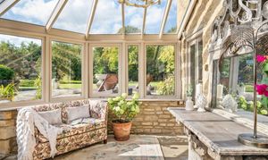 Tucked off the sitting room, the sunny conservatory drinks in the lush and far-reaching garden views, this time opening up to another stone paved patio, replete with flower beds perfect for growing cut flowers.