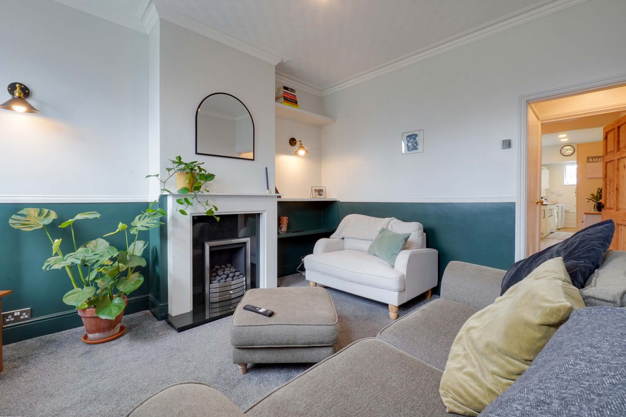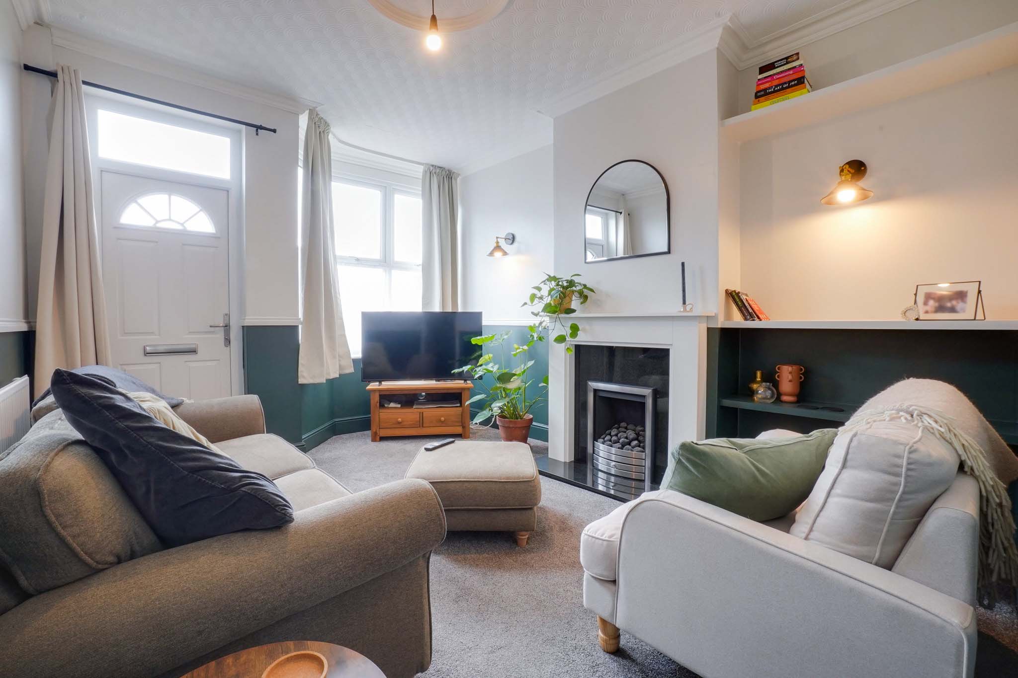 The accommodation includes two spacious reception rooms and a well-presented kitchen complete with oven, hob, microwave, fridge freezer, washing machine, and dishwasher. Upstairs, there are two recently redecorated bedrooms along with a stylish modern bathroom.