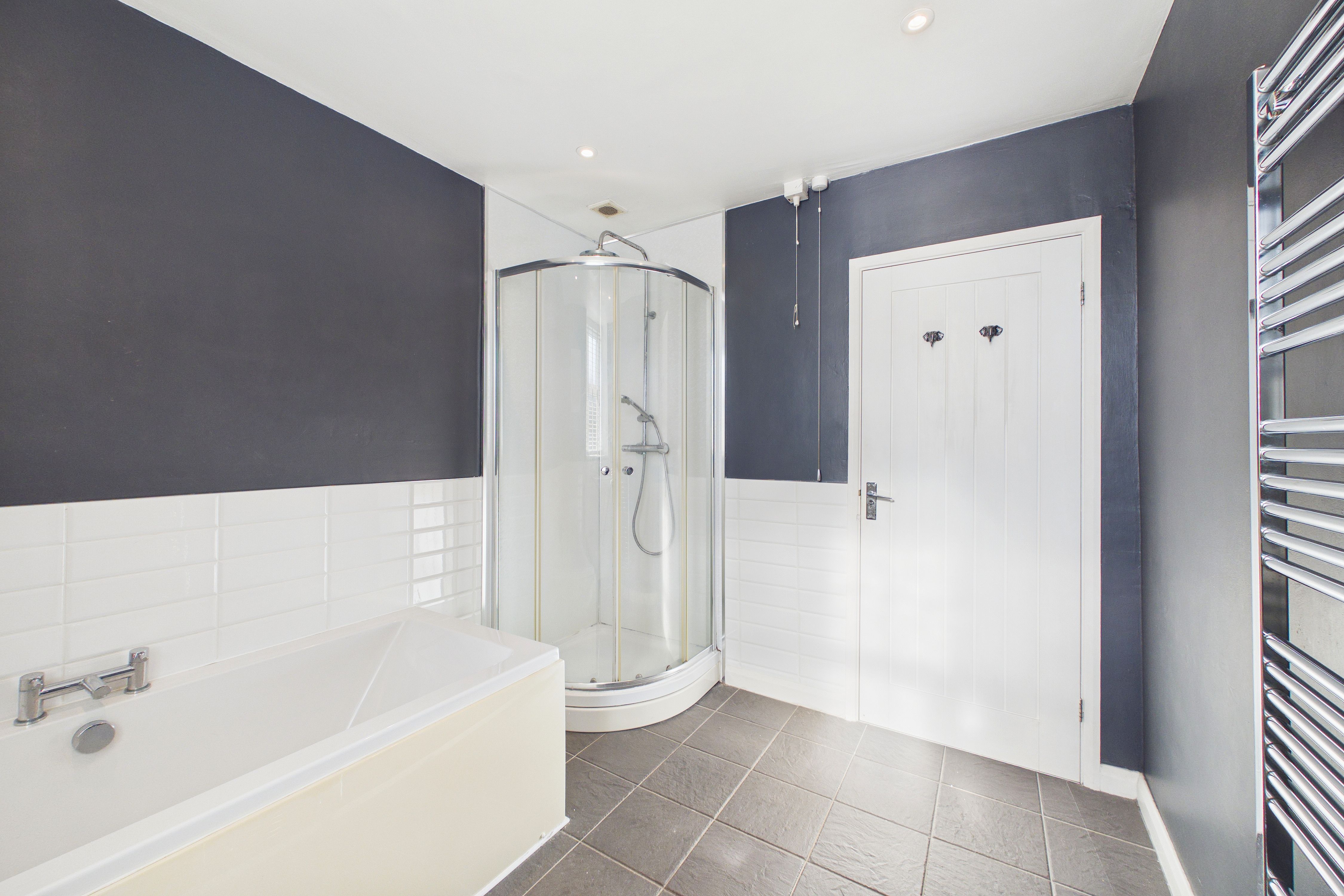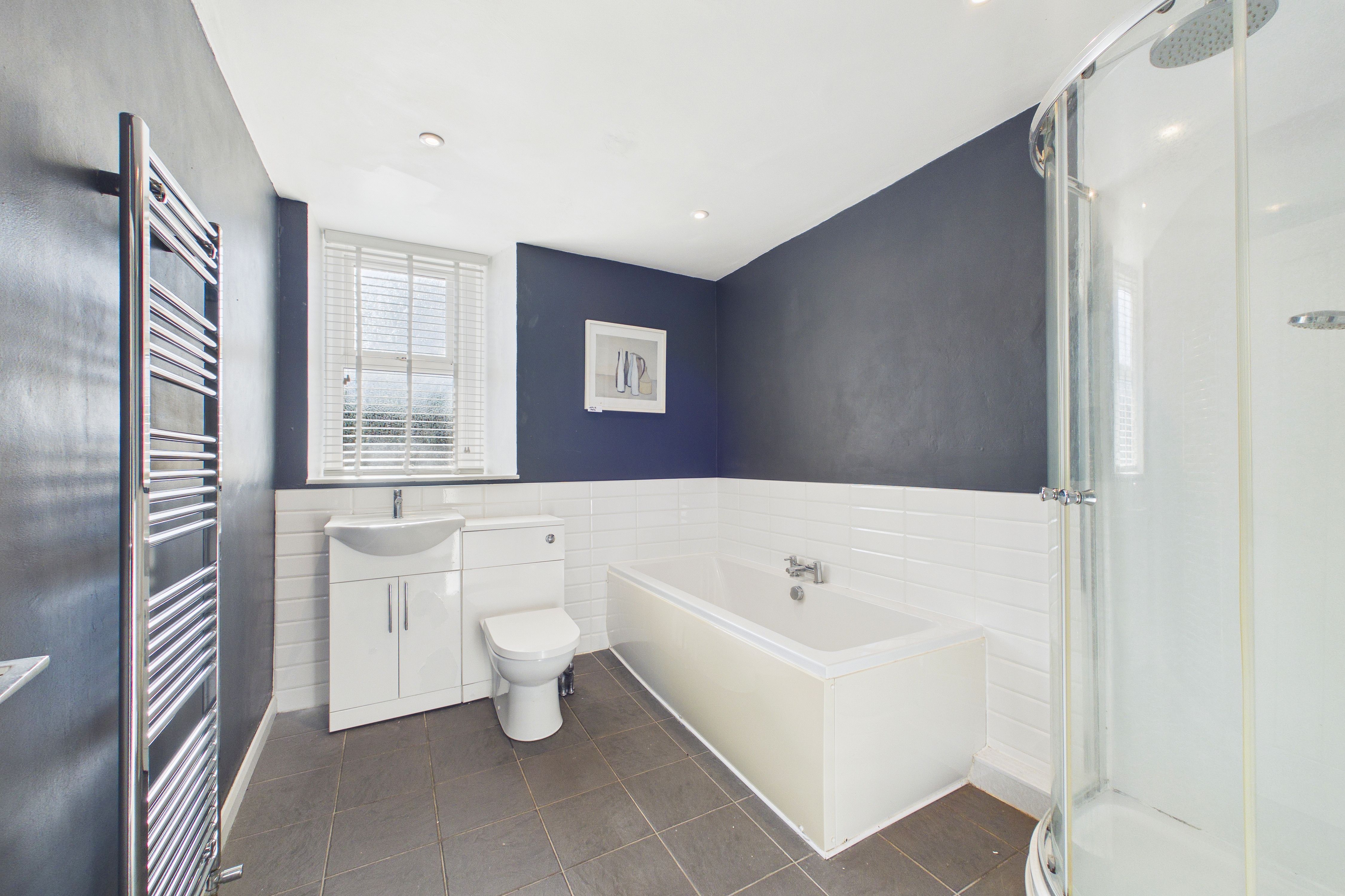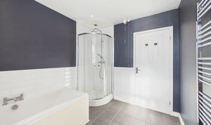 The stylish family bathroom boasts a four piece suite with corner shower cubicle, separate bath and vanity unit the incorporates the toilet and sink.