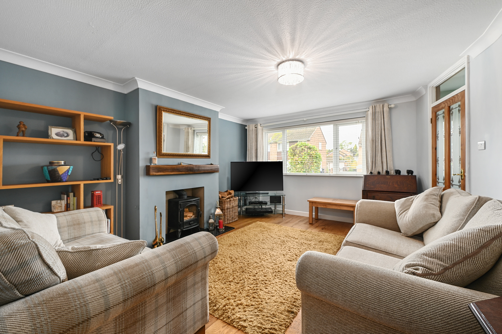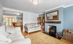 Window outlook to front, log burner open through to dining room.